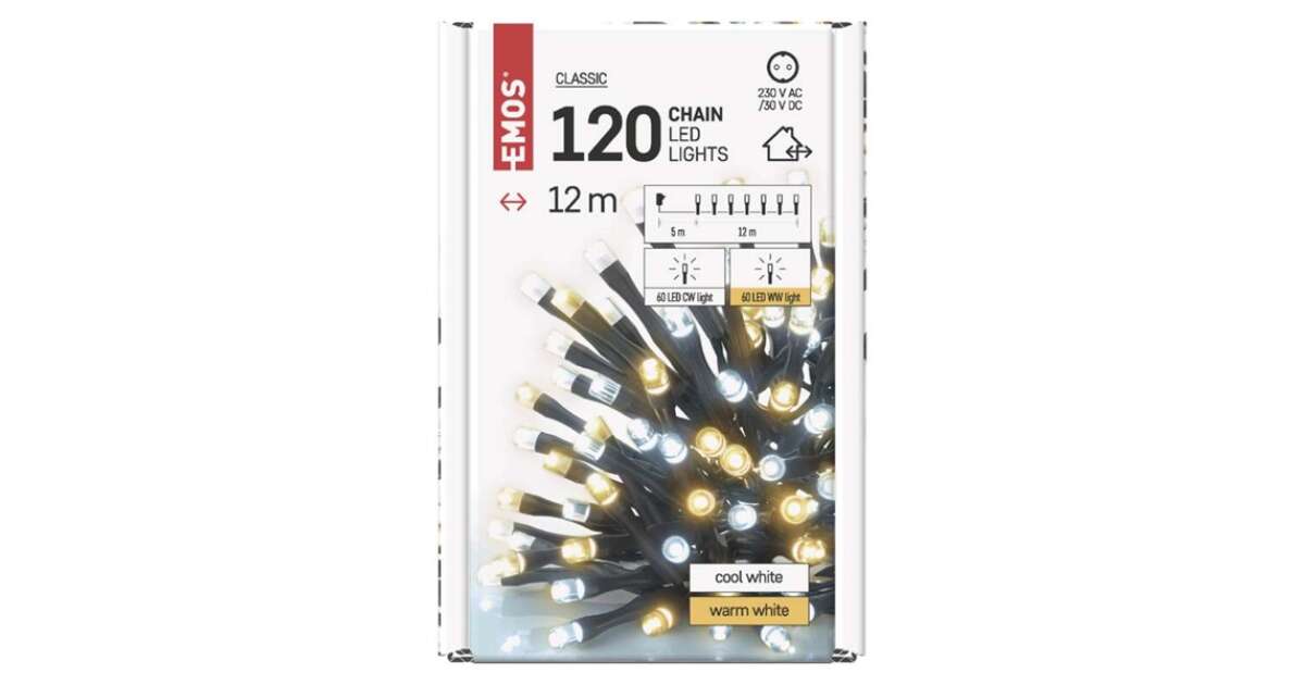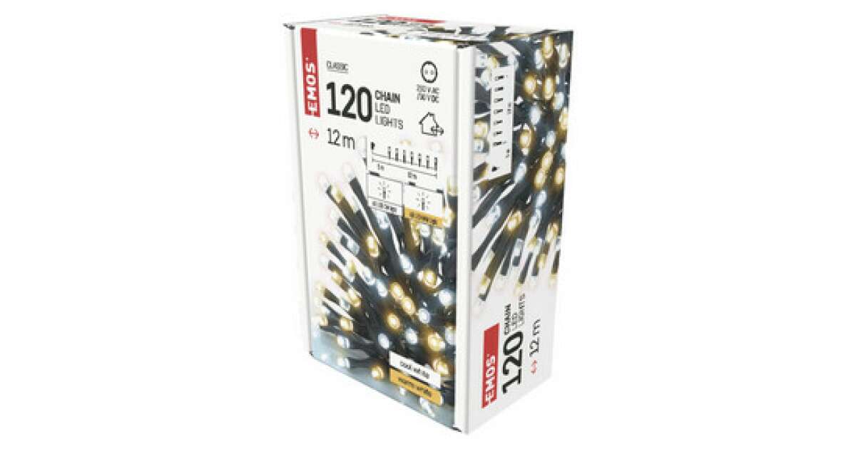 Lampka choinkowa zewnętrzna/wewnętrzna z wyłącznikiem czasowym, 12 m, ciepła/chłodna biel, 120 LED, z adapterem opis
