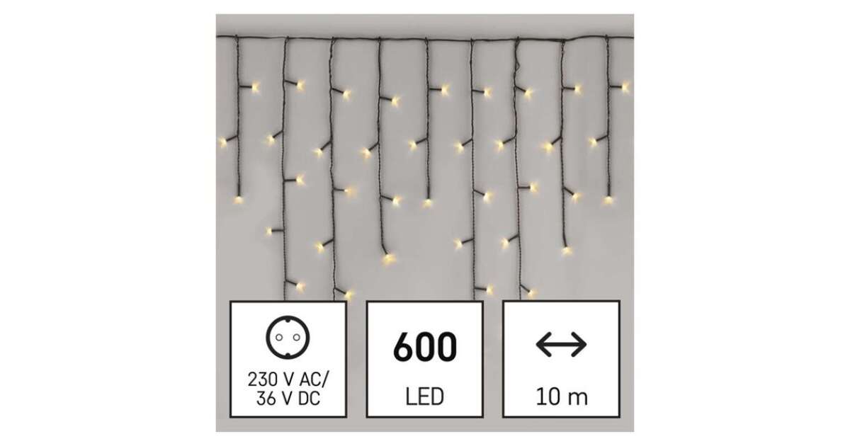 Zaczaruj swój dom lub ogród tą 10-metrową girlandą świetlną LED w kształcie sopli lodu! 600 ciepłych białych diod LED zapewni przytulną atmosferę, zarówno wewnątrz, jak i na zewnątrz. Wybierz swój ulubiony spośród 8 różnych programów, aby idealnie dopasować go do świątecznej dekoracji.