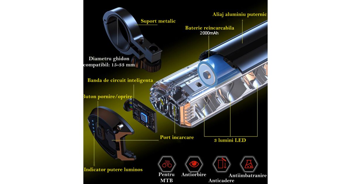 Inteligentny hamulec rowerowy z czujnikiem hamulca i systemem sygnalizacji, profesjonalne przednie światło 900 lumenów, ładowanie przez USB, alarm i klakson w zestawie, 6 trybów światła hamow opis