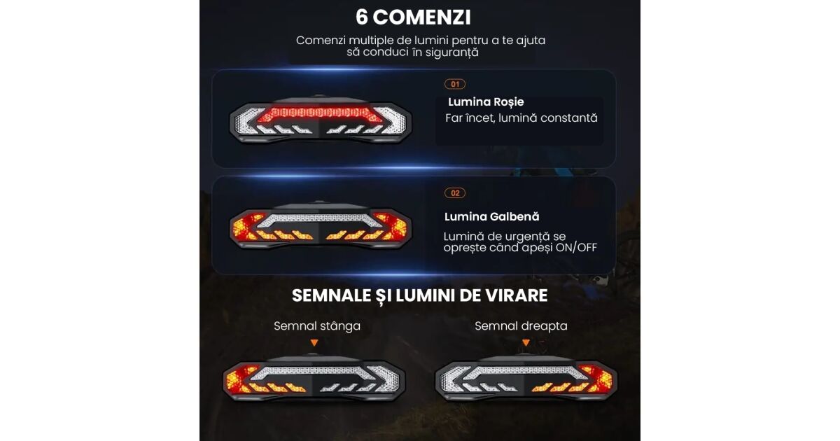 - 6 trybów świecenia: światło ciągłe, wolne miganie, szybkie miganie, tryb oddechowy, sygnalizacja hamowania, kierunkowskazy