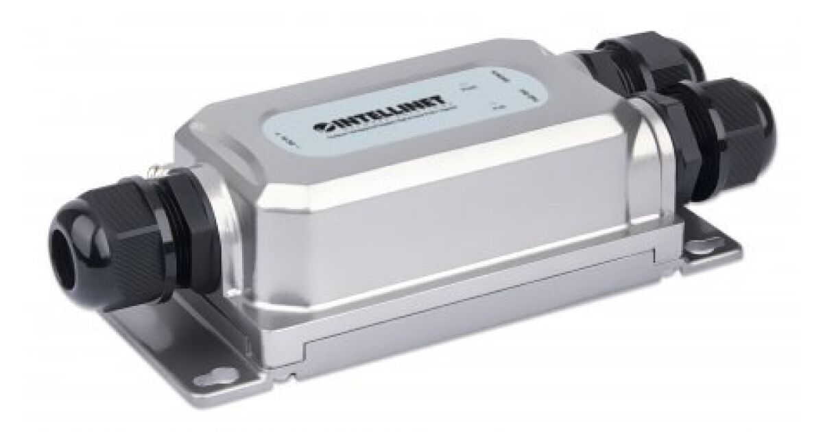 Intellinet 561778. Rodzaj interfejsu sieci Ethernet: Fast Ethernet, Gigabit Ethernet, Prędkość transferu danych przez Ethernet LAN: 10,100,1000 Mbit/s, Standardy komunikacyjne: IEEE 802.3, IEEE 802.3ab, IEEE 802.3af, IEEE 802.3at, IEEE 802.3u. Kolor produktu: Czarny, Szary, Maksymalny zasięg działania: 100 m, Stopień ochrony IP: IP67. Moc rzeczywista: 30 W, Napięcie: 24 - 56 V, Prąd wejściowy: 1.5 A. Certyfikaty: FCC Class A, CE, RoHS. Szerokość produktu: 73 mm, Głębokość produktu: 150 mm, Wysokość produktu: 44 mm