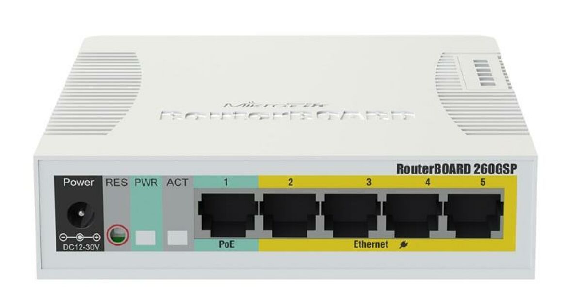 MikroTik RB260GSP/CSS106-1G-4P-1S switch PoE 5 portów GbE 1xGbE SFP opis