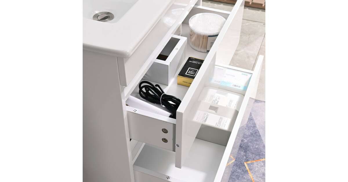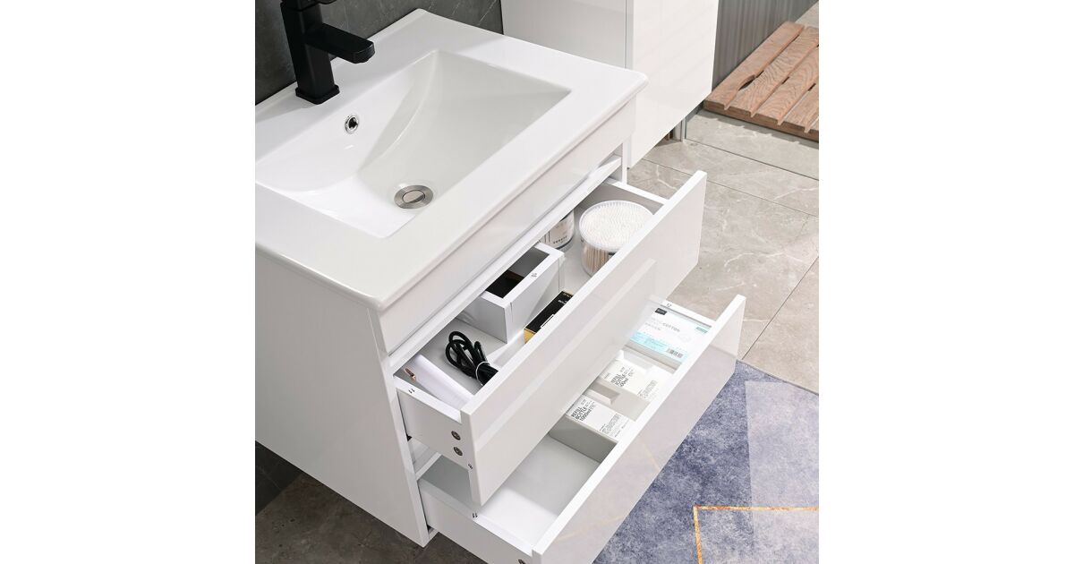 - Dwie pojemne szuflady: Wygodne miejsce do przechowywania kosmetyków, ręczników i innych akcesoriów łazienkowych.