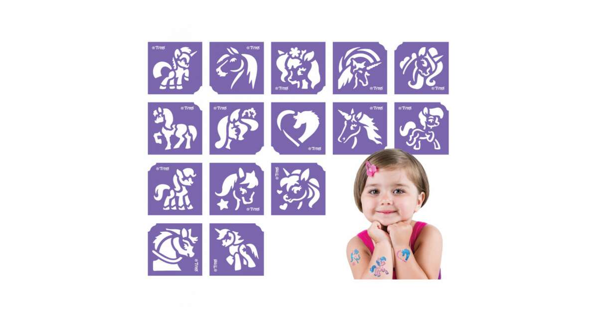 Stwórz wspaniałe tatuaże brokatowe dla swojej córeczki dzięki temu zestawowi 15 uroczych szablonów z jednorożcami! Są łatwe w użyciu i gwarantują świetną zabawę.