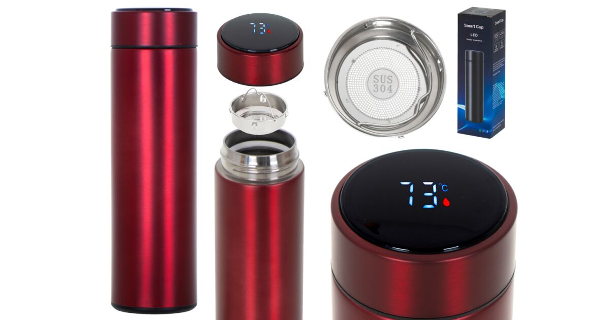 -Inteligentny termos KIK o pojemności 500 ml, wyświetlacz temperatury LED, metalowe sitko, kolor bordowy opis