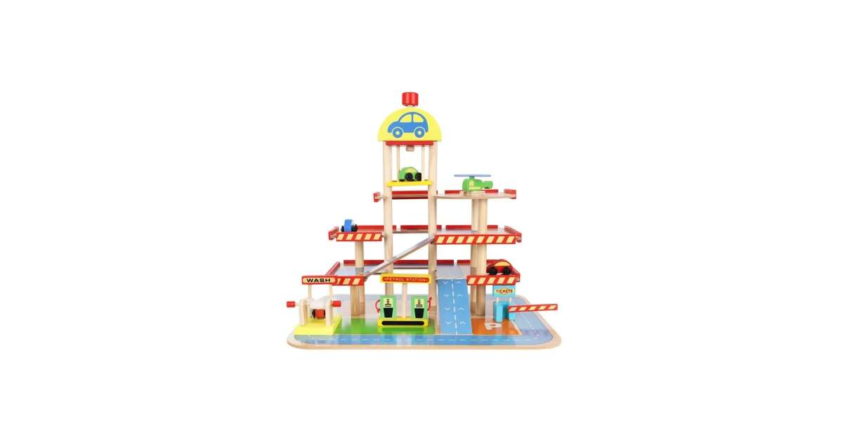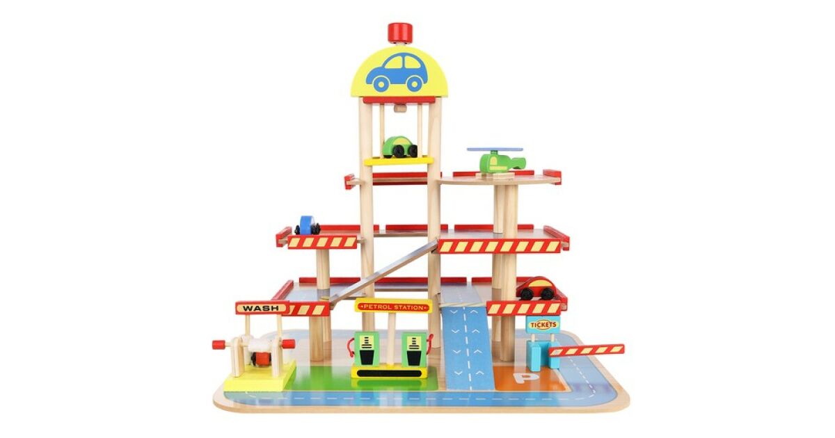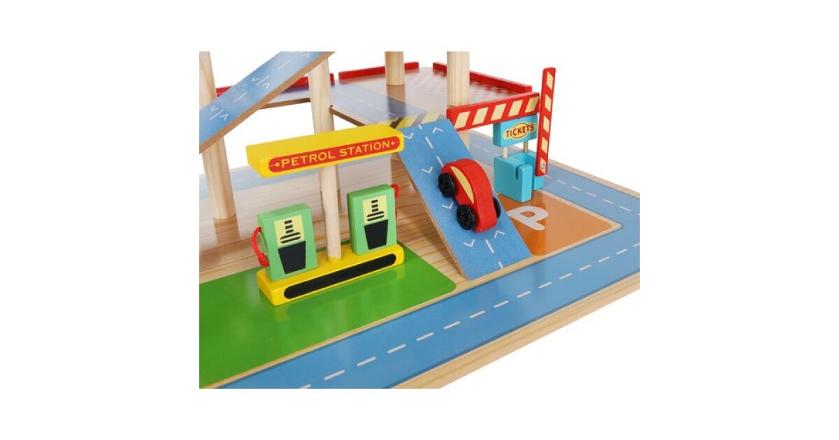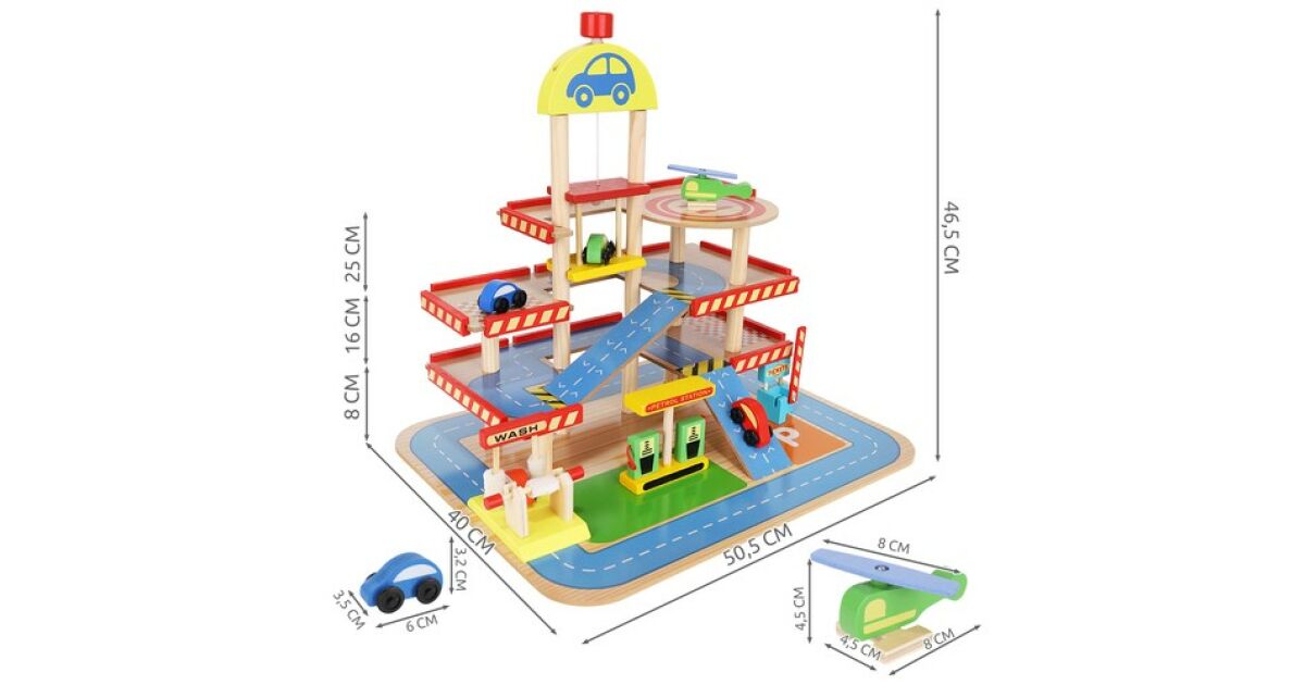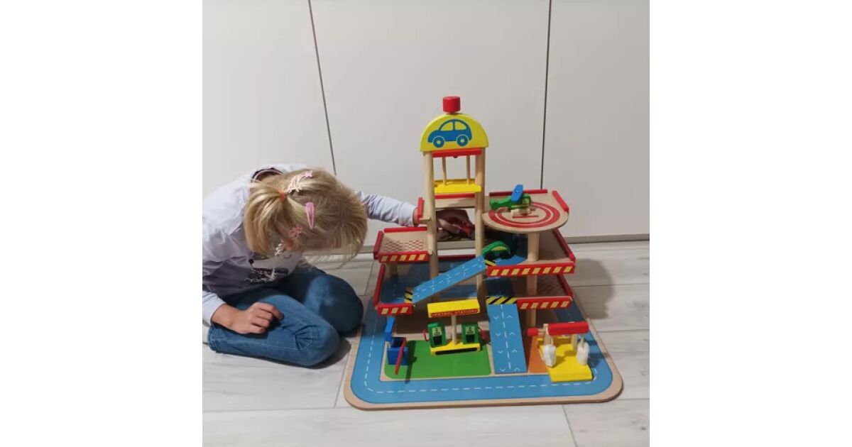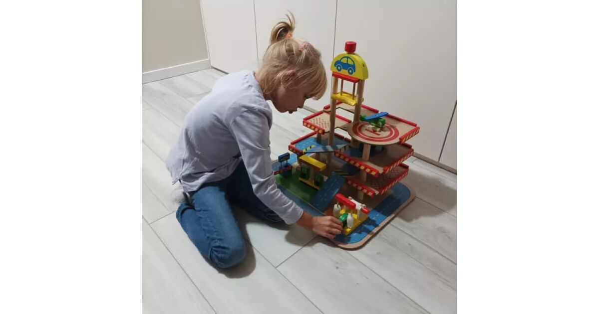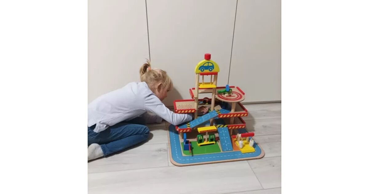 Ten kolorowy, drewniany parking składający się z 27 elementów to super frajda dla każdego małego fana motoryzacji! Ma aż cztery poziomy, windę, stację benzynową, myjnię i lądowisko dla helikopterów, więc zabawa nigdy się nie nudzi.
