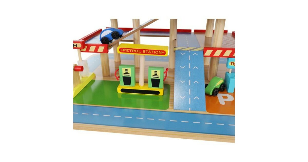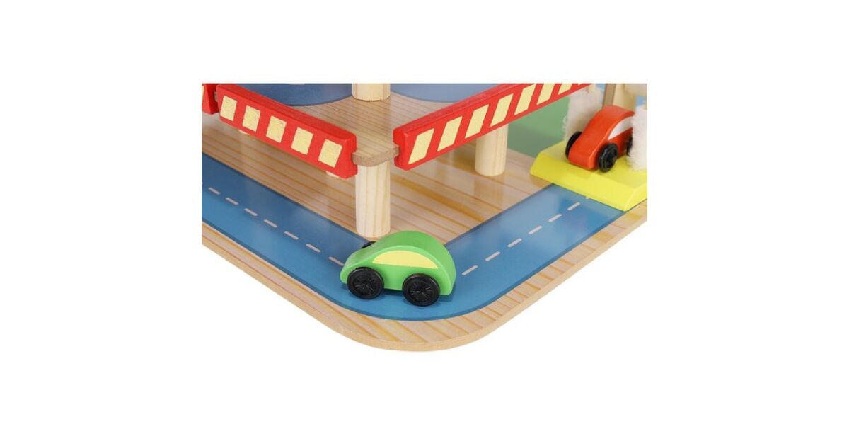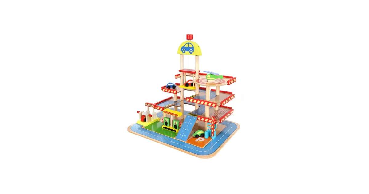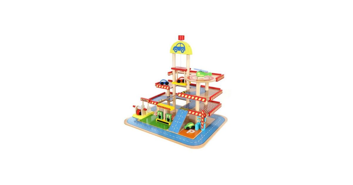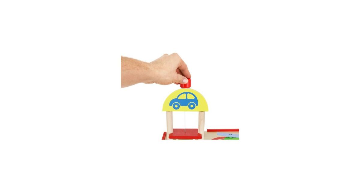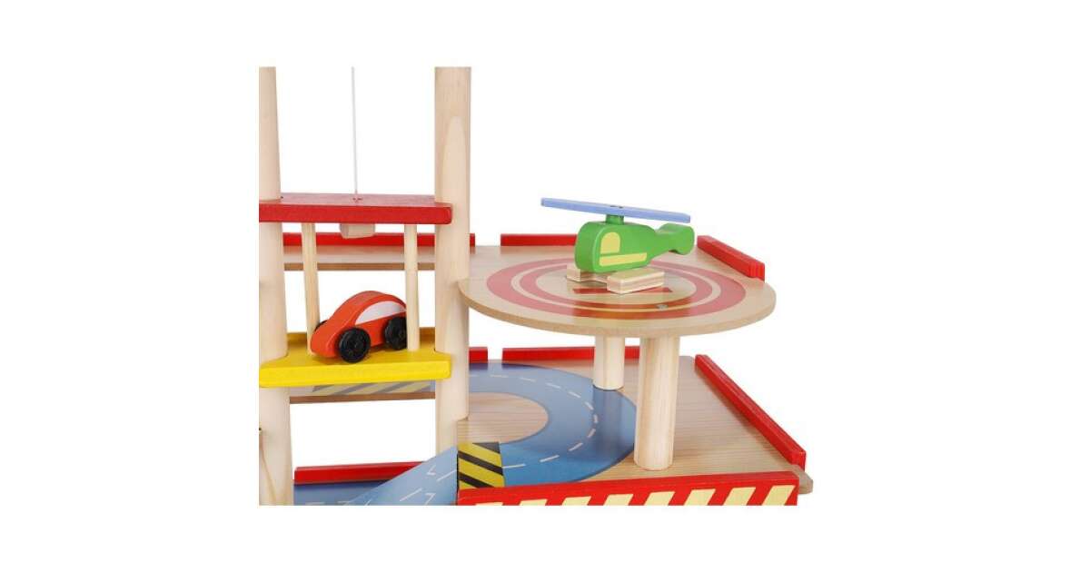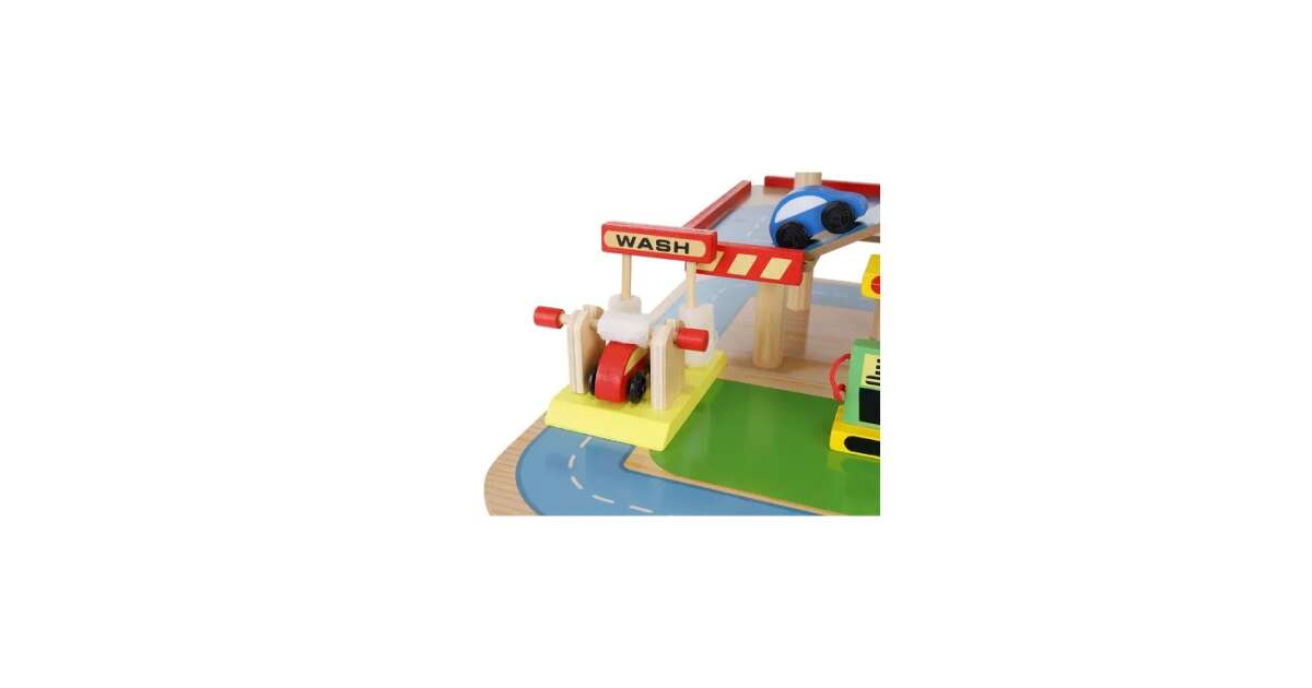 Ten kolorowy, drewniany parking składający się z 27 elementów to super frajda dla każdego małego fana motoryzacji! Ma aż cztery poziomy, windę, stację benzynową, myjnię i lądowisko dla helikopterów, więc zabawa nigdy się nie nudzi.