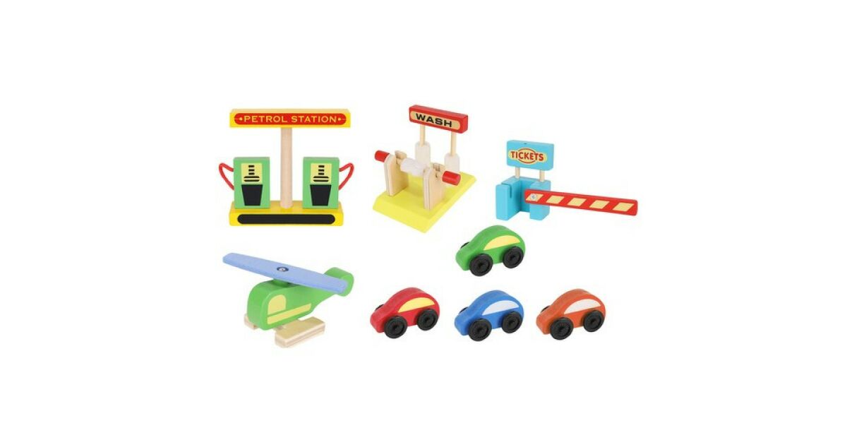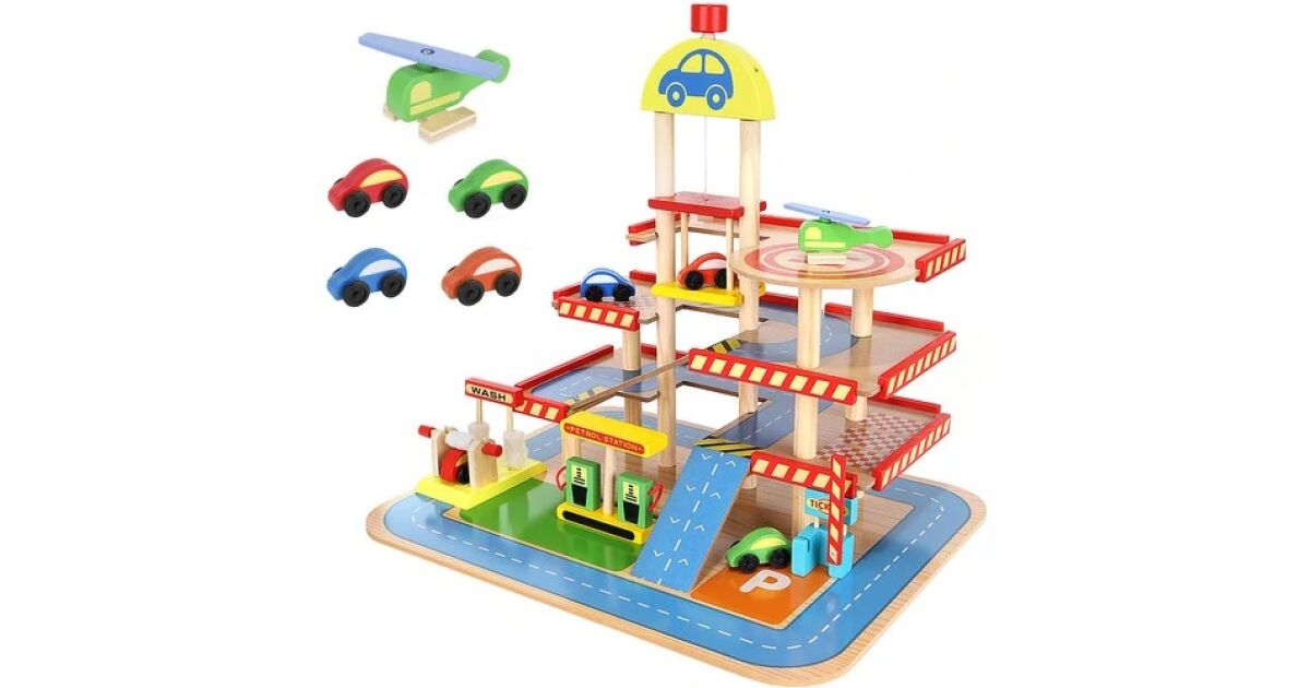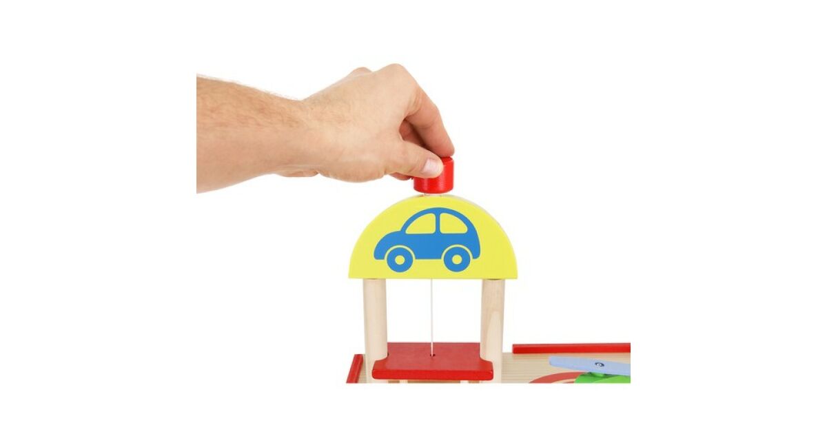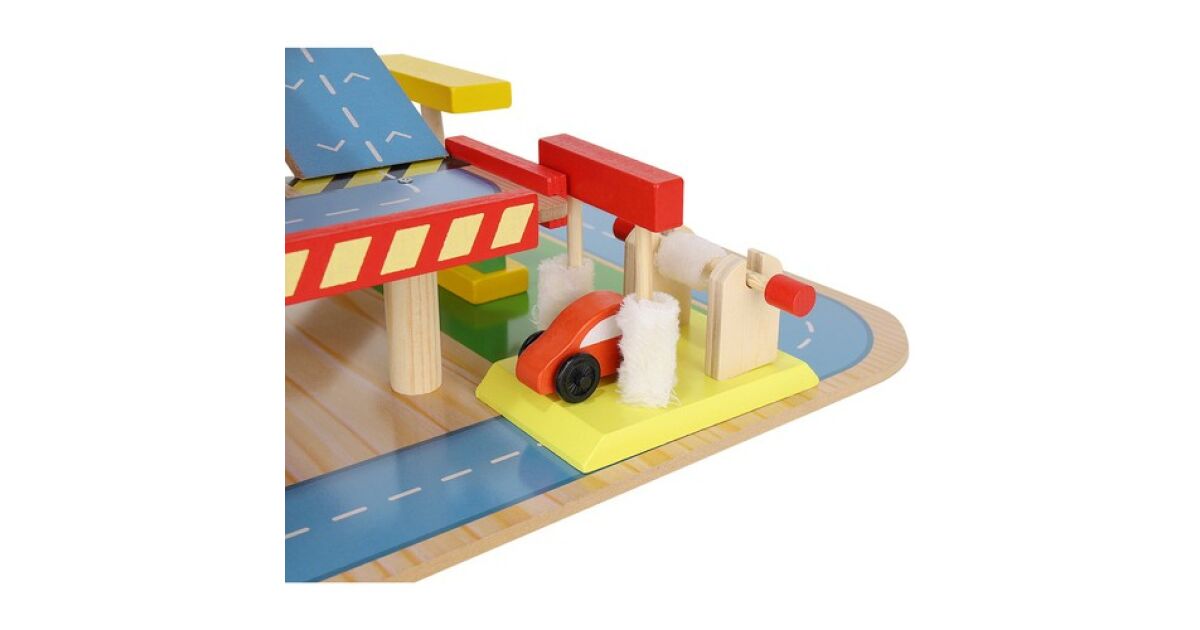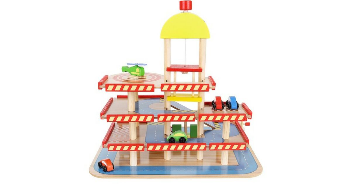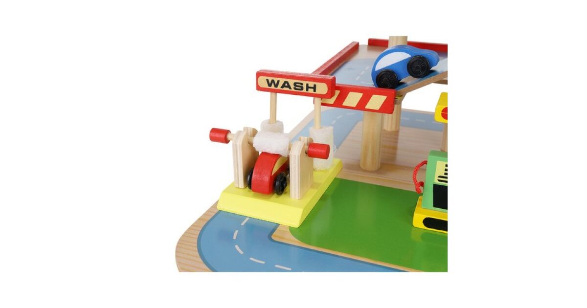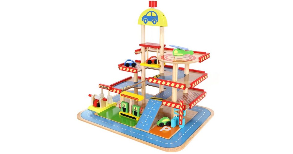 Ten kolorowy, drewniany parking składający się z 27 elementów to super frajda dla każdego małego fana motoryzacji! Ma aż cztery poziomy, windę, stację benzynową, myjnię i lądowisko dla helikopterów, więc zabawa nigdy się nie nudzi.