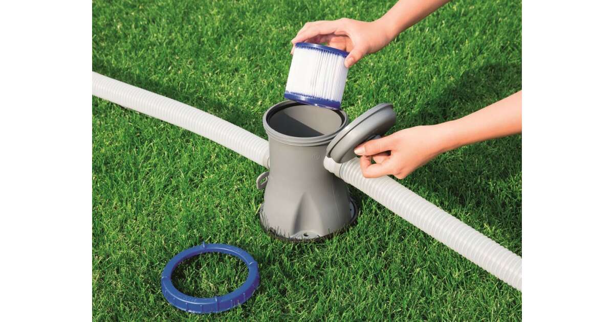 Wymianę wkładu filtracyjnego należy przeprowadzić pod nadzorem osoby dorosłej. Wyłącz pompę, odkręć pokrywę, zdejmij uszczelkę i pokrywę filtra. Po usunięciu starego filtra, umieść nowy.