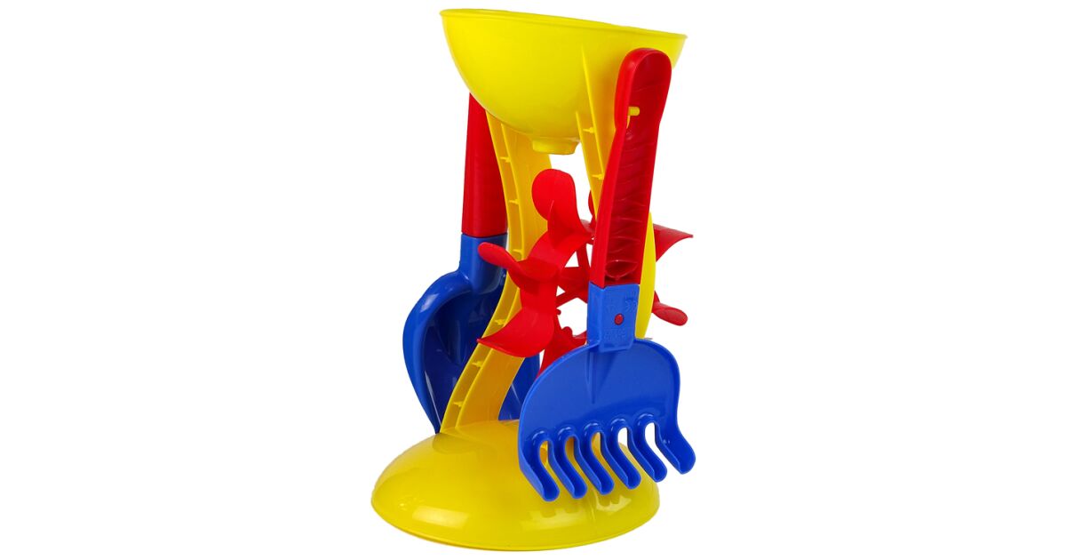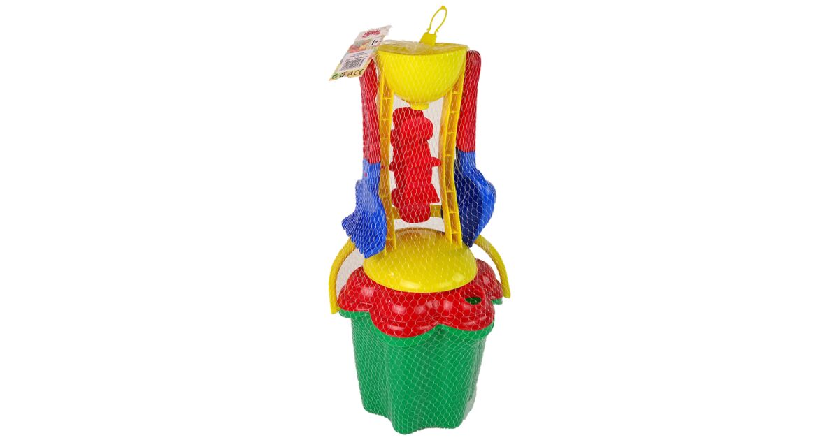 W zestawie znajduje się wiaderko Kwiatek z sitkiem, 2 foremki delfinek i foczka, łopatka, grabki oraz młynek do przesypywania piasku lub przelewania wody. Nasz dzieciak na pewno nie będzie się nudził na plaży, czy podczas kąpieli bawiąc się młynkiem.Wymiary w [mm]: 205x460Zabawka dostępna w miksie kolorów: czerwony, zielony, żółty, niebieski. Zdjęcie poglądowe. Produkt wysyłany losowo.