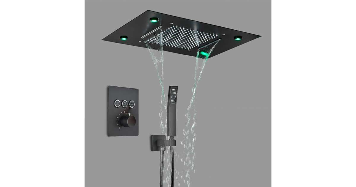 Ten inspirowany skandynawskim designem, matowoczarny zestaw prysznicowy z 2 funkcjami (deszcz i wodospad) zagwarantuje Ci idealne wrażenia podczas prysznica. Wbudowane oświetlenie LED stworzy przyjemny nastrój, a termostat zapewni wybraną temperaturę. Za pomocą pilota zdalnego sterowania możesz z łatwością regulować funkcje prysznica i oświetlenie.