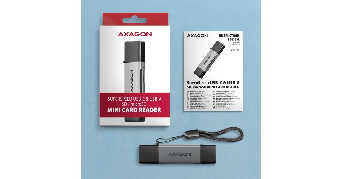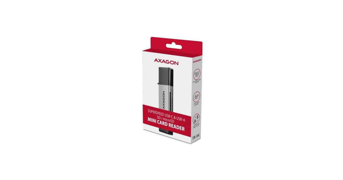 Axagon CRE-DACMobilny czytnik kart pamięci Mini AXAGON CRE-DAC z interfejsem USB 5 Gbps obsługuje wszystkie aktualne wersje kart SD i microSD w tym SDXC i microSDXC o pojemności do 2TB. Dużą zaletą czytnika jest zarówno złącze USB-C, jak i złącze USB-A, dzięki czemu połączenie jest naprawdę uniwersalne. Czytnik można podłączyć bezpośrednio do wszystkich komputerów stacjonarnych lub laptopów, a także do telefonów i tabletów ze złączem USB-C.Dzięki interfejsowi USB 3.2. Gen 1 (USB 3.0) czytnik kart osiąga wyższe szybkości transmisyjne w wypadku kart SD UHS-I od czytników kart z interfejsem USB 2.0. Czytnik kart umożliwia jednoczesną obsługę kart w obu gniazdach oraz bezpośrednie kopiowanie między nimi.Metalowa obudowa czytnika nie tylko świetnie wygląda, ale również zwiększa trwałość czytnika. Oba złącza zabezpieczone są zaślepkami podczas transportu. Instalacja jest bardzo łatwa, czytnik wprowadzić do portu USB komputera a reszta odbędzie się całkowicie automatycznie. Specyfikacja techniczna:Gwarancja producenta: 24 miesiąceInterfejs: USB 3.1 Gen 1Wymiary: 70 x 17 x 10 mmKolor: srebrnyMasa: 14 gPrędkość transmisji: 5000 / 480 / 12 / 1.5 Mbit/s (super / high / full / low speed)Obsługiwane karty pamięci: Micro SD: microSD/microSDHC/microSDXC/TransFlash | SD: Secure Digital, SDHC, SDXC, MultiMedia Card, MMC 4.0, MMC Dual Voltage, MMC mobile, RS-MMC, z adapter miniSD, microSD, microSDHC, microSDXC, MMC Micro.