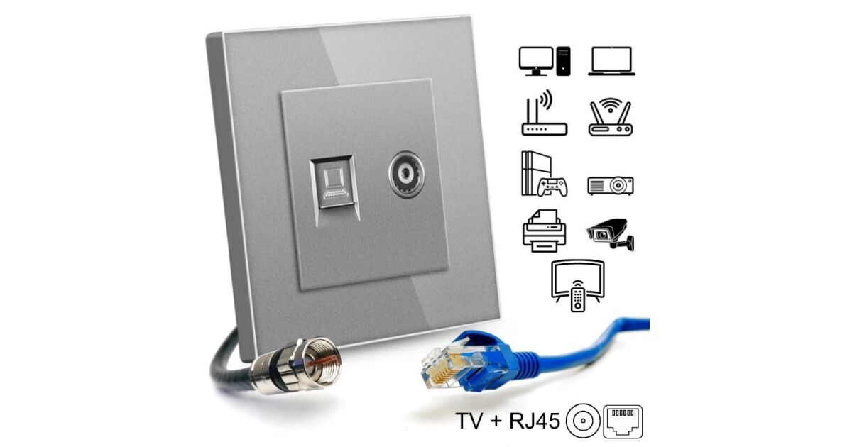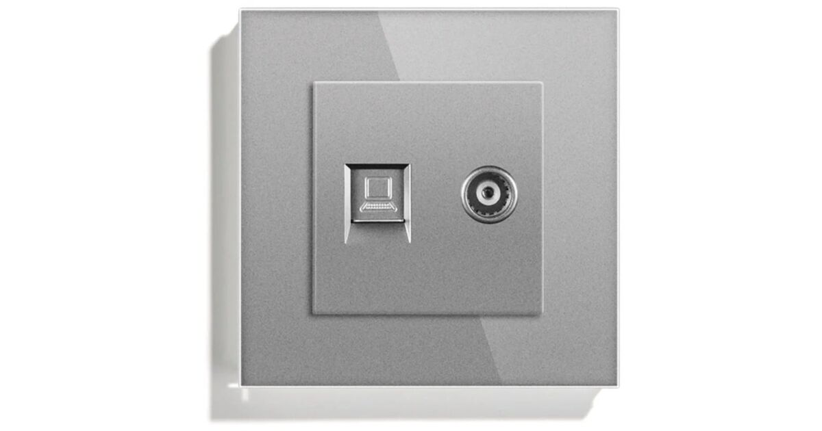 Gniazdo TV + Internet RJ45, Cat6, Ramka ze szkła hartowanego, iUni TDS, Srebrny