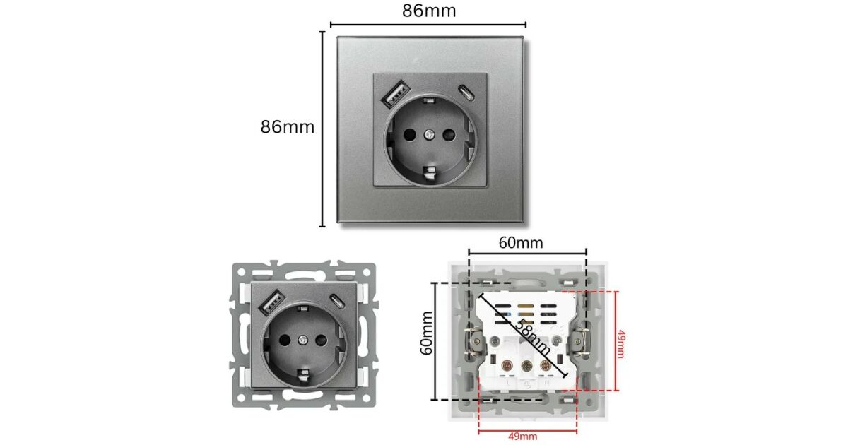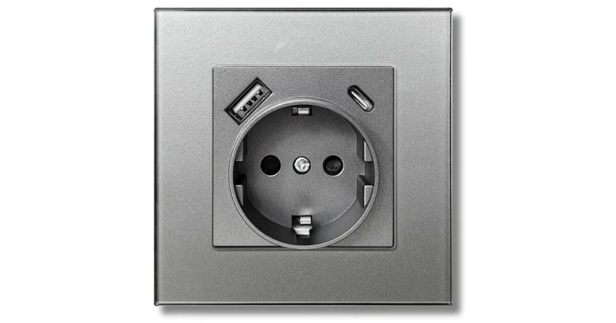 Gniazdo ze szkła hartowanego, porty USB-A i USB-C, iUni UC1, 16A, srebrny opis