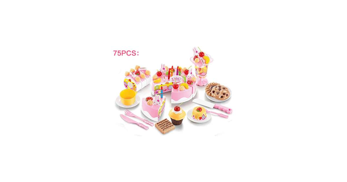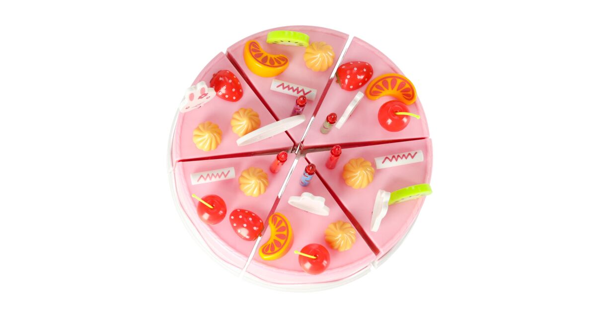 Ten 75-elementowy zestaw do ciasta zapewni mnóstwo zabawy małym cukiernikom! Różowy kolor i mnóstwo drobnych elementów gwarantują wesołą zabawę. Ciasto w zestawie można kroić na kawałki, łączyć za pomocą rzepu i ozdabiać naklejkami, co rozwija wyobraźnię i kreatywność dzieci. Klienci podkreślali, że mnóstwo drobnych elementów oraz możliwość naklejania i używania rzepu sprawiają, że zabawa jest wyjątkowo wciągająca.