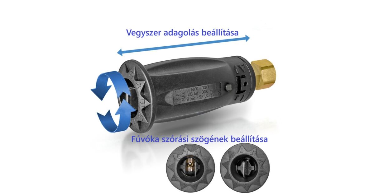 Duză reglabilă MTM Hydro "DUALJET" 035 cu funcție de distribuire a substanțelor chimice pentru mașini de spălat cu presiune înaltă cu racord filetat de 1/4" (galben) Descriere