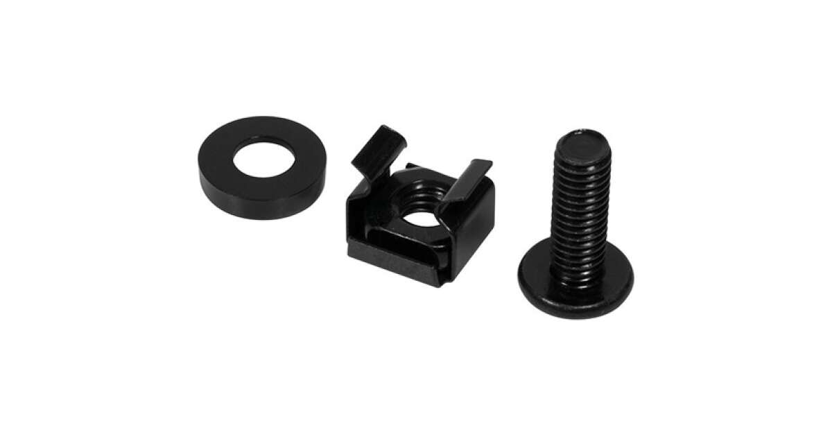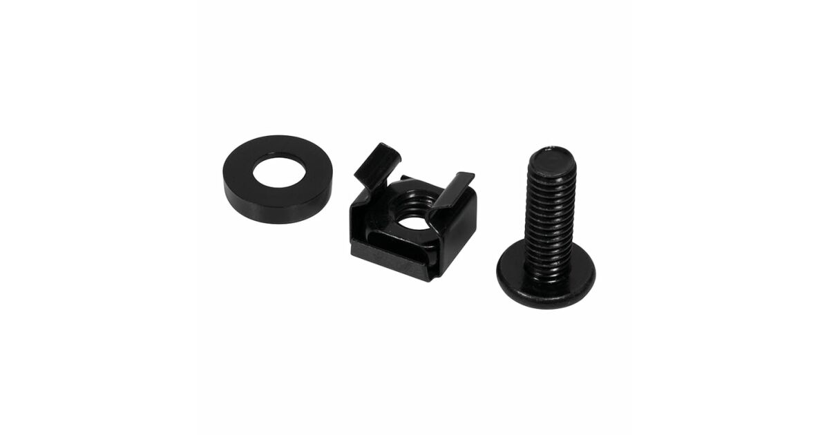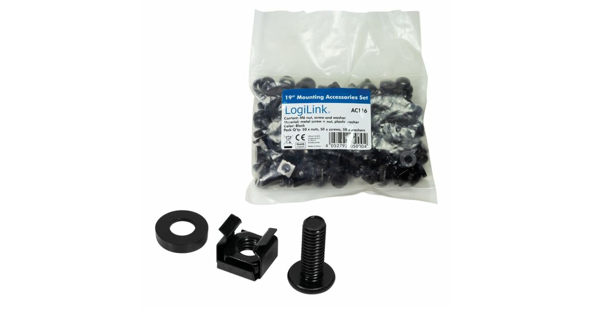 Set de șuruburi LogiLink M6: 50 de șuruburi, piulițe și șaibe negre pentru o montare stabilă