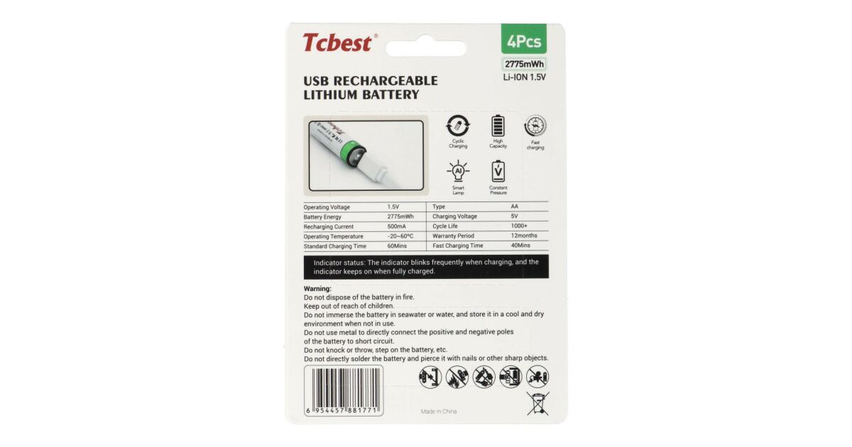 Aceste baterii reîncărcabile AA TCBEST sunt soluția perfectă pentru a înlocui bateriile de unică folosință. Cu o capacitate de 750 mAh, acestea oferă suficientă energie pentru dispozitivele de zi cu zi, cum ar fi telecomenzi, lanterne, jucării și alte gadgeturi electronice. Portul USB-C încorporat permite o încărcare rapidă și convenabilă, iar cablul inclus permite încărcarea simultană a 4 baterii.