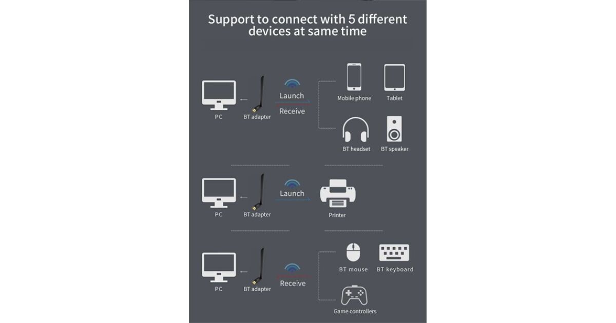 Acest adaptor USB Bluetooth 5.3 compact oferă o conexiune wireless de înaltă calitate pentru diverse dispozitive Bluetooth, cum ar fi căști, boxe, tastaturi, mouse-uri și dispozitive mobile. Datorită celei mai recente tehnologii Bluetooth 5.3, te poți bucura de o transmisie de date mai stabilă și mai rapidă, cu mai puține interferențe.