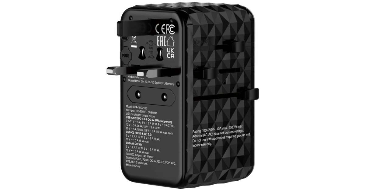 Adaptor calatorie universal Verbatim 32125 GaN III, 140W, 2 x USB-C® PD 3.1 & QC 4+ 140W, 1 x USB-C PD 3.0 18W / 1 x USB-A QC 3.0 18W, Negru Descriere