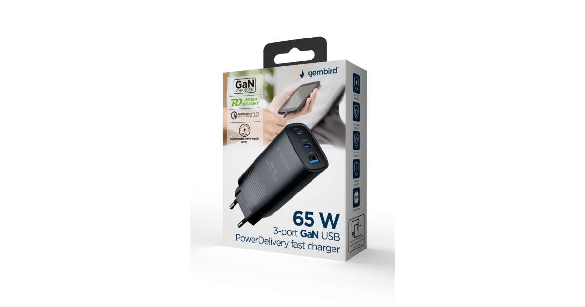 Încărcător rapid USB cu trei porturi Gembird de 65 W: Încarcă-ți dispozitivele rapid și eficient! 🚀