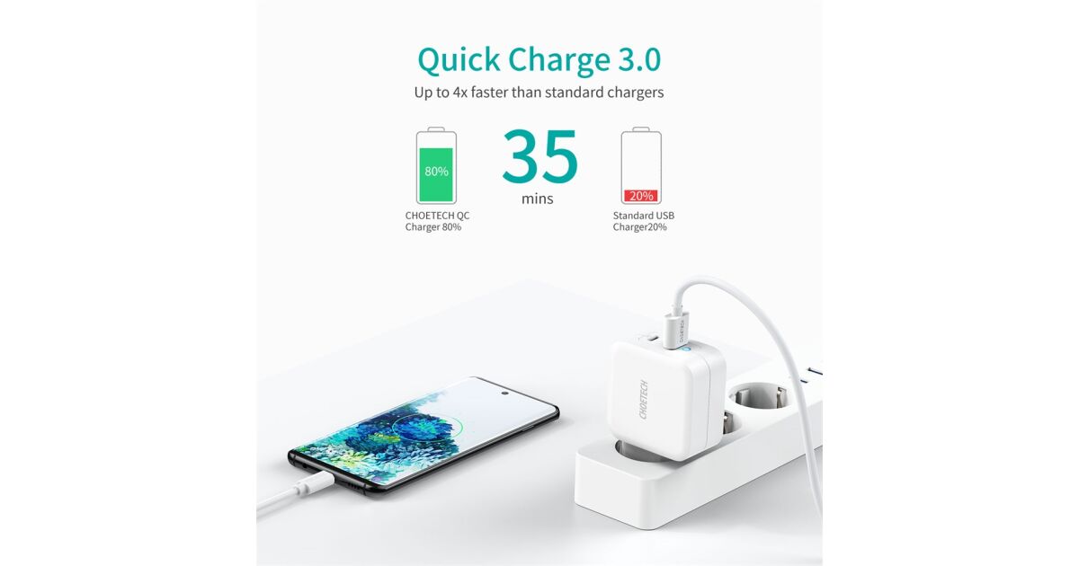 Incarcator de retea, Choetech, PD8002, Alb, 65W, 3,25A, 1xUSB, 1xUSB-C, PD, GaN, Quick Charge 3.0, Compatibilitate larga Descriere