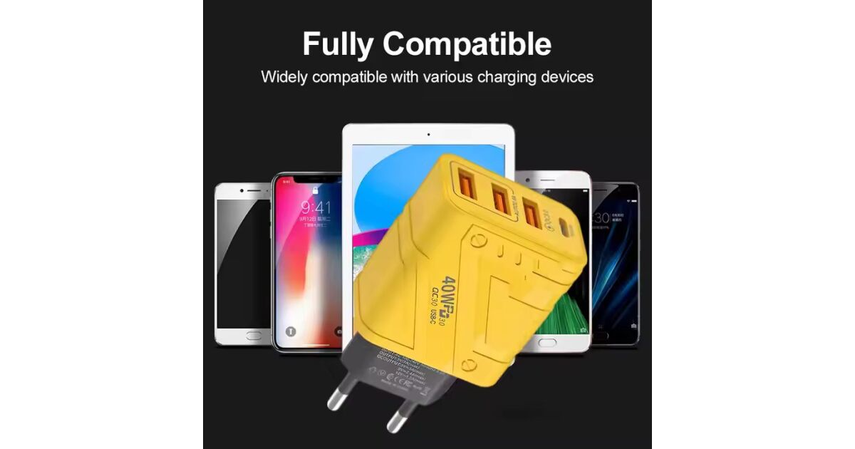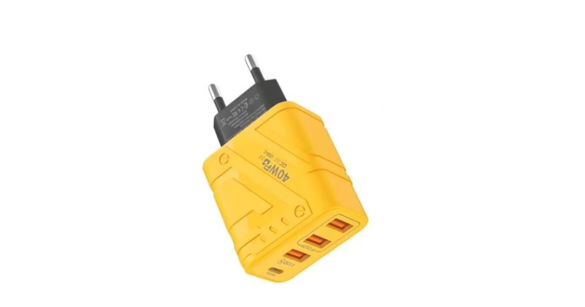 Încărcător Rapid 40W de culoare galbenă, 3 Porturi USB + 1 Port USB-C, Tehnologie QC 3.0 și PD 20W, Design Compact și Durabil compatibil cu Apple/Huwaei/Samsung/Xiaomi Descriere