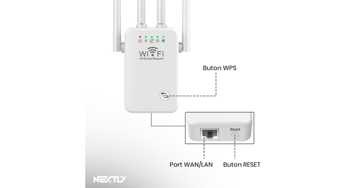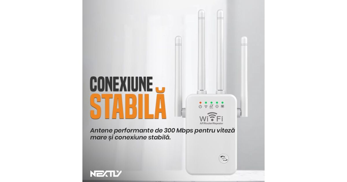 Amplificator de semnal Wi-Fi NEXTLY, 4 antene, 2, 4GHz, 300Mbs, repeater, 802.11/a/n/g/b, port LAN, conectare wps, semnal puternic, alb Descriere
