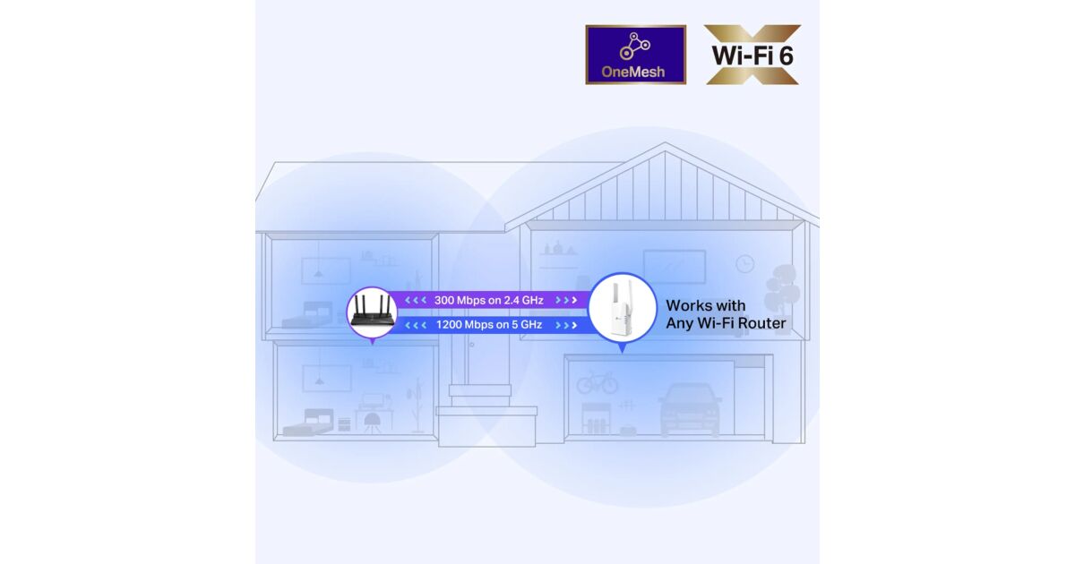 Range Extender TP-Link RE505X Wi-Fi 6 Dual-Band Gigabit AX1500, tehnologie OneMesh, Adaptive Path, Mod High Speed, Mod Access Point (RE505X) Descriere