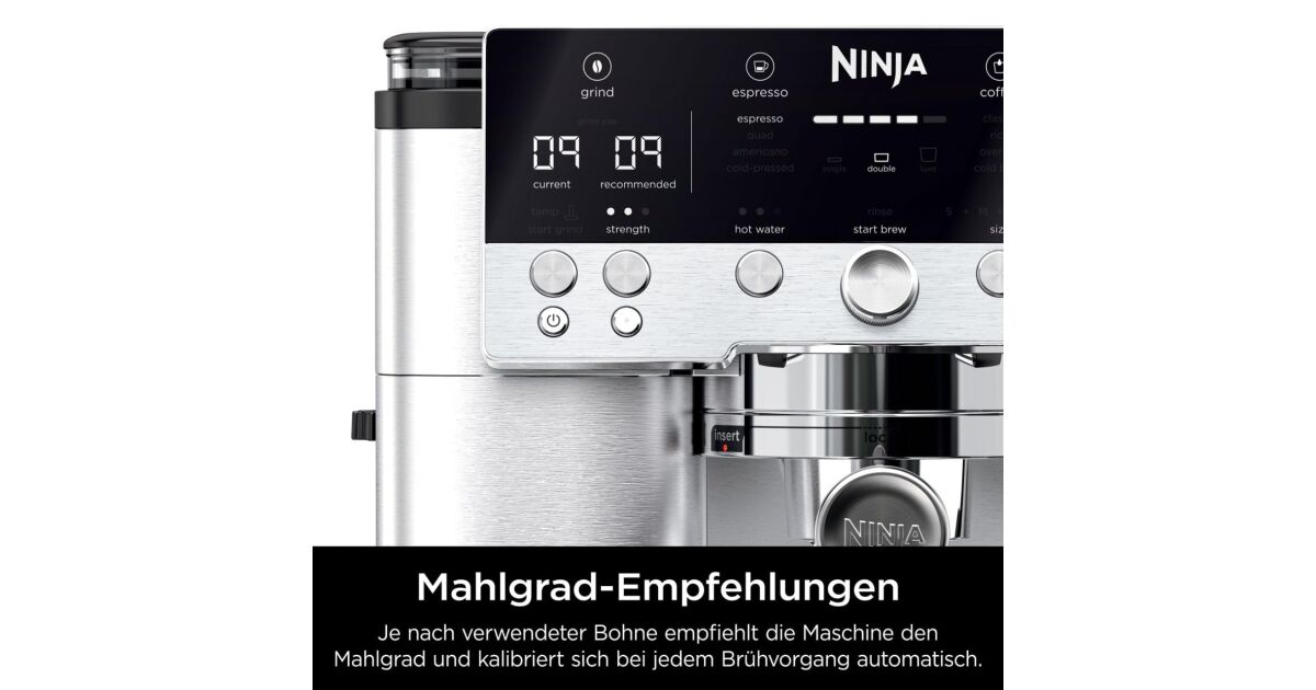 Aparat de cafea Ninja Luxe Premier 3-in-1 cu rasnita si spumant pentru Latte, Cappuccino, Cold Brew si Espresso, usor de utilizat, 4 presetari pentru spumare, mufa UE, argintiu, ES601EU