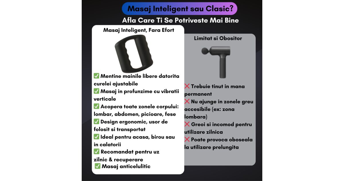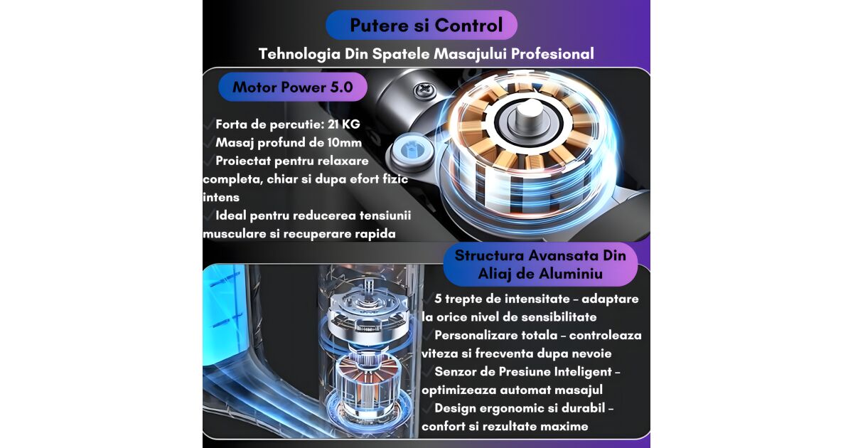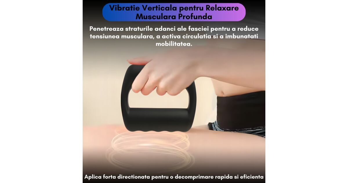 - 💪 Masaj profund cu vibrații: Tehnologia cu percuție verticală relaxează țesuturile și reduce aciditatea musculară.