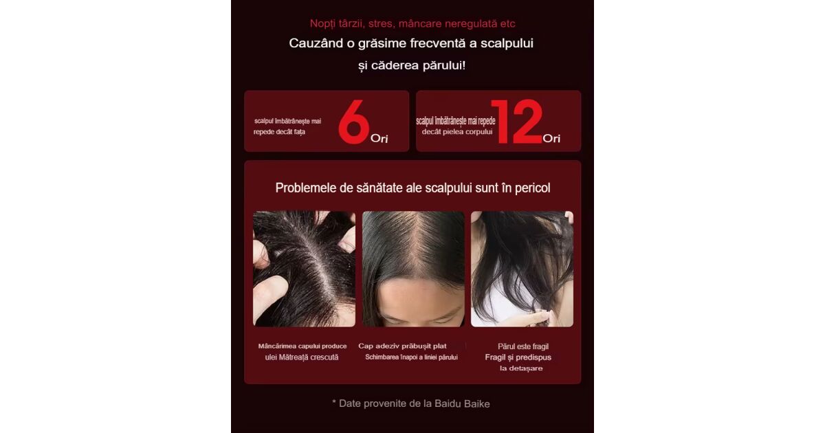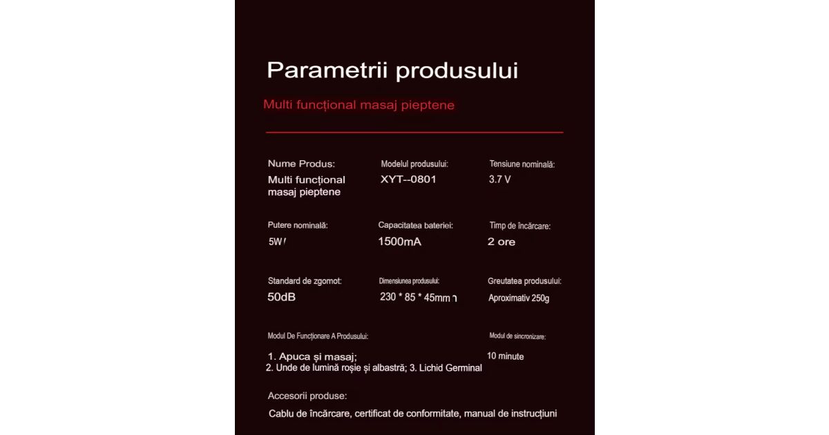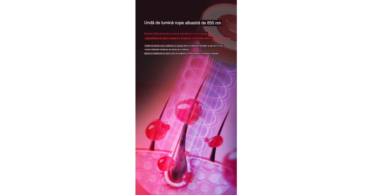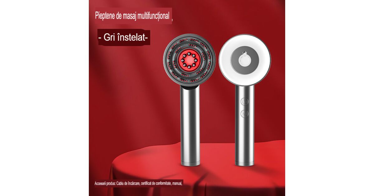 Masaj Profesional cu Lumina Infrarosie: Lumina infrarosie – Stimuleaza circulatia sanguina si promoveaza cresterea sanatoasa a parului. 72 de perii moi si flexibile – Asigura un masaj delicat si eficient, fara iritatii. Design Compact si Multi-functional: Aplicator de uleiuri esentiale (6ml) – Permite distribuirea uniforma a uleiurilor pentru hidratare si nutritie profunda. Rezistenta la apa (waterproof) – Usor de curatat si de utilizat in dus. Dimensiuni compacte (2308545mm) – Perfecta pentru calatorii si utilizare zilnica. Performanta Superioara: Baterie reincarcabila (1500mAh) – Asigura pana la 2 ore de utilizare continua dupa o incarcare de doar 2 ore. 3 moduri de functionare: Masaj clasic – Pentru relaxare si stimularea circulatiei. Lumina rosie si albastra – Terapie combinata pentru scalp si par. Aplicator de lichid germinal – Pentru ingrijire si hidratare profunda. Siguranta si Confort: Zgomot redus (50dB) – Utilizare discreta si placuta. Greutate usoara (250g) – Usor de manipulat si de utilizat pentru perioade lungi. Beneficii Cheie: