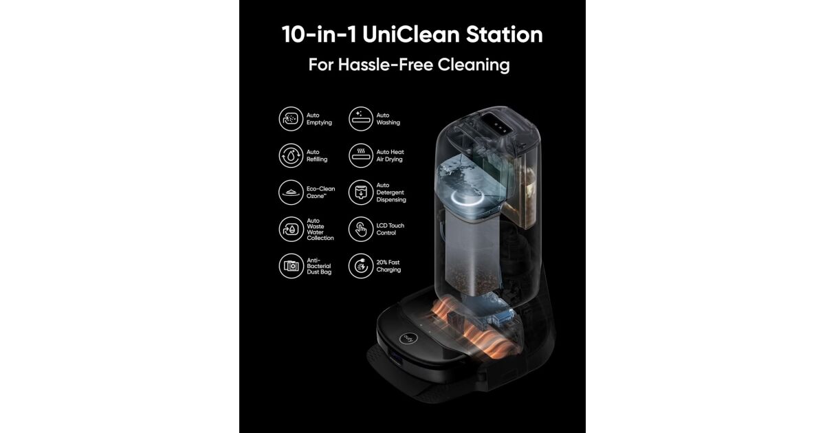 - Stație UniClean 10 în 1: Golire automată, spălare, reumplere, uscare, sistem Eco-Clean Ozone, dozare detergent și multe altele! Bucură-te de o curățenie fără griji. 💯