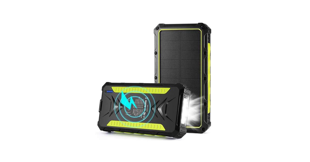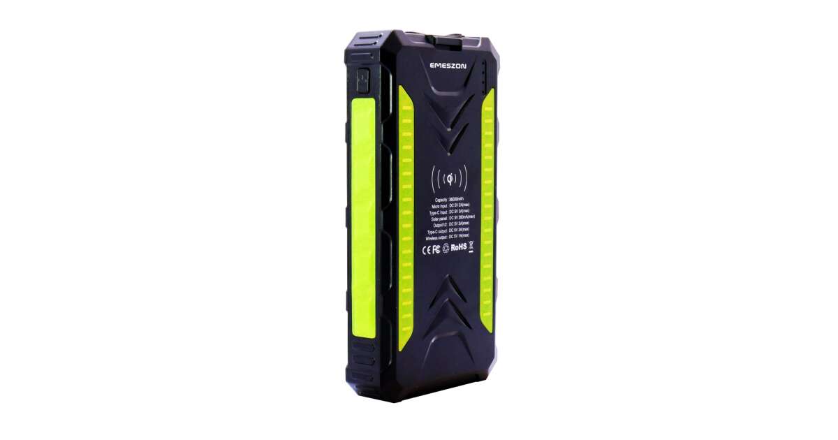 Power bank Baterie externa solara A+, Emeszon®, 36000 mAh, Type C USB 3A, incarcare wireless, IP66, LED, Quick Charge 3.0, negru-verde Descriere