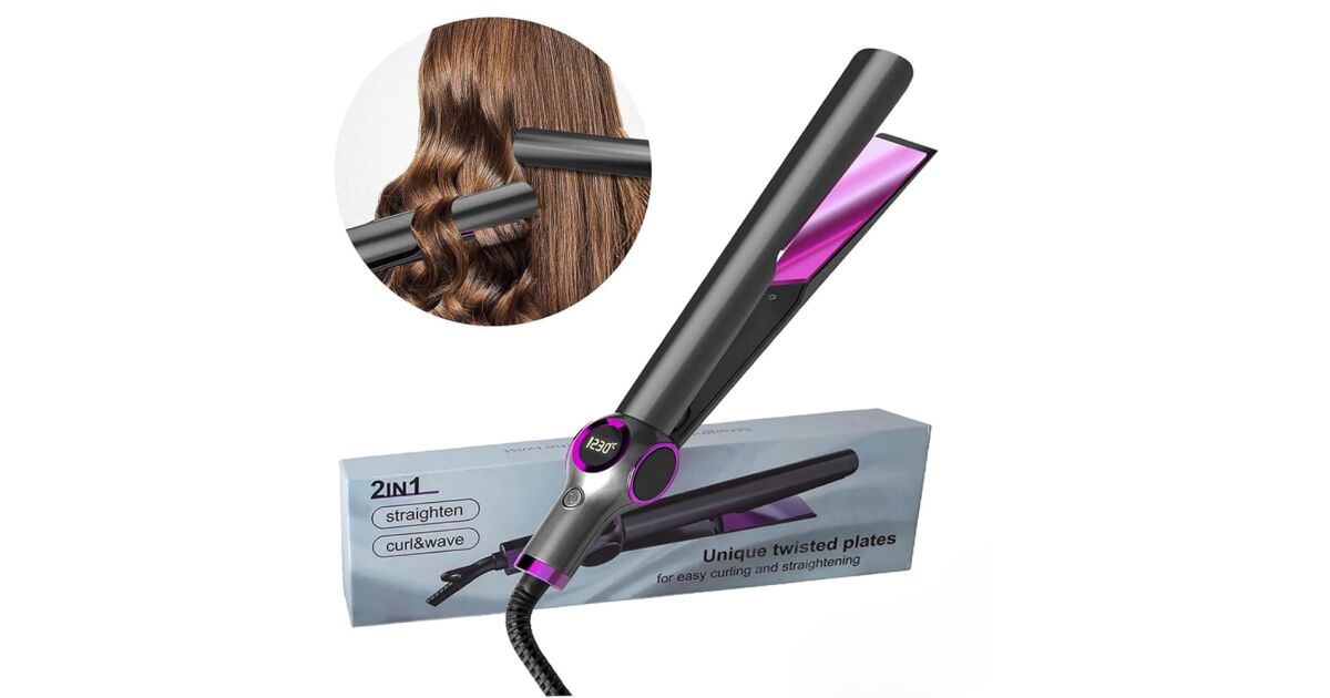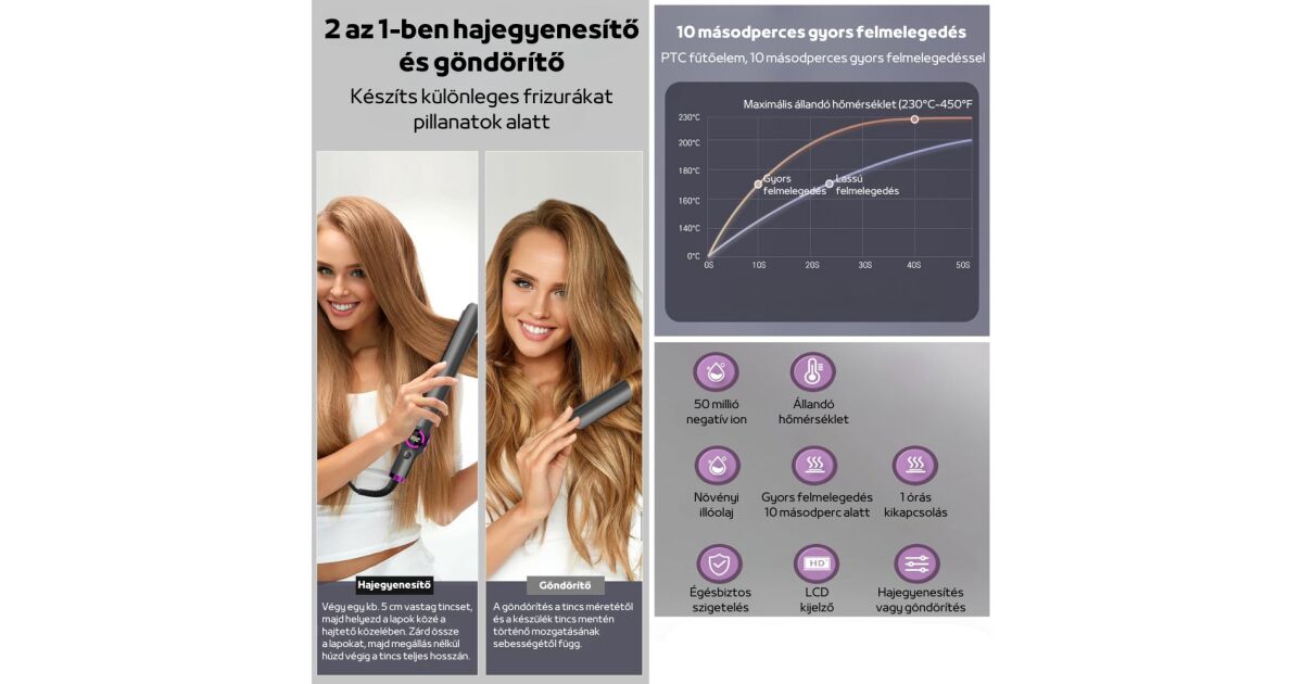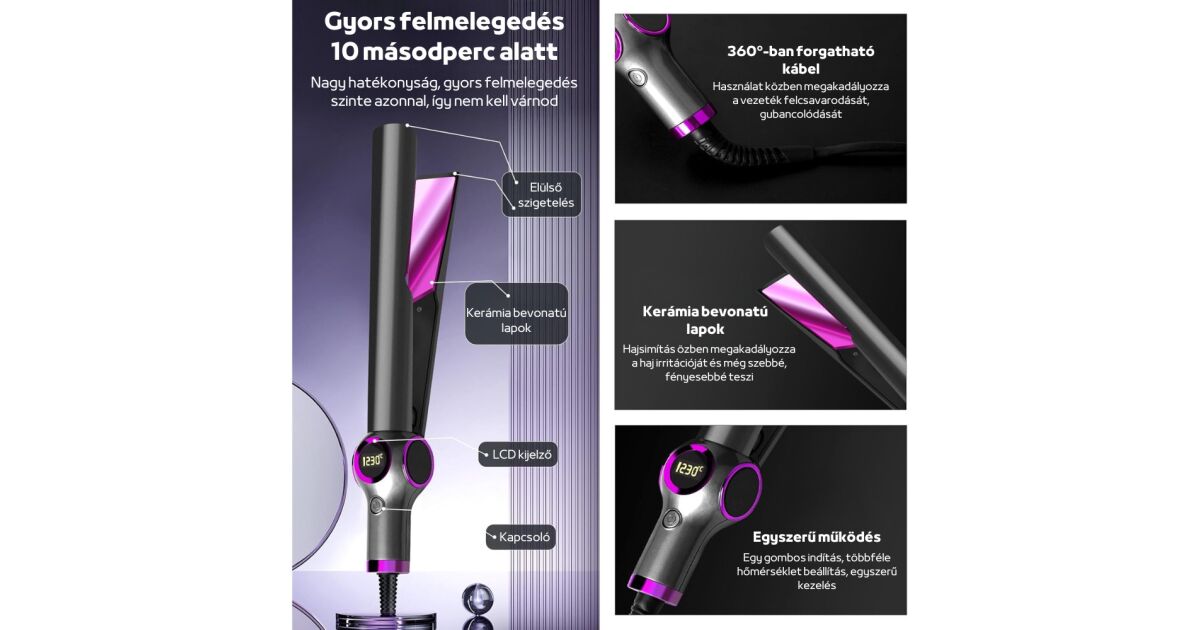 Placa și ondulatorul de păr 2 în 1 cu încălzire rapidă, temperaturi multiple, afișaj LCD - gri-violet Descriere