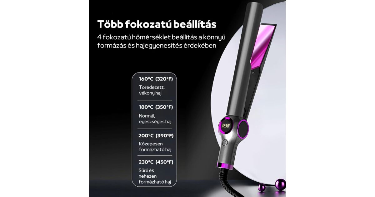 - 🌡️ Setări multiple de temperatură: 4 trepte pentru diferite tipuri de păr (160°C, 180°C, 200°C, 230°C)