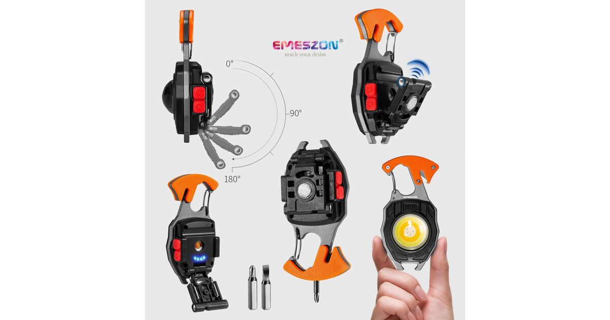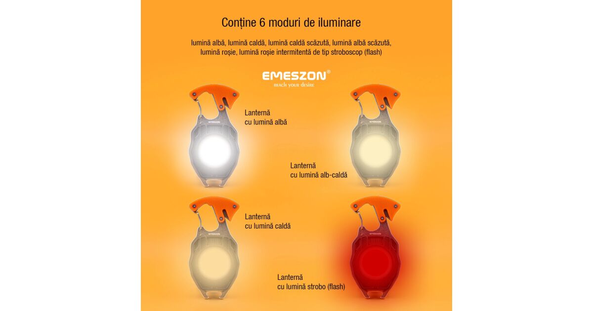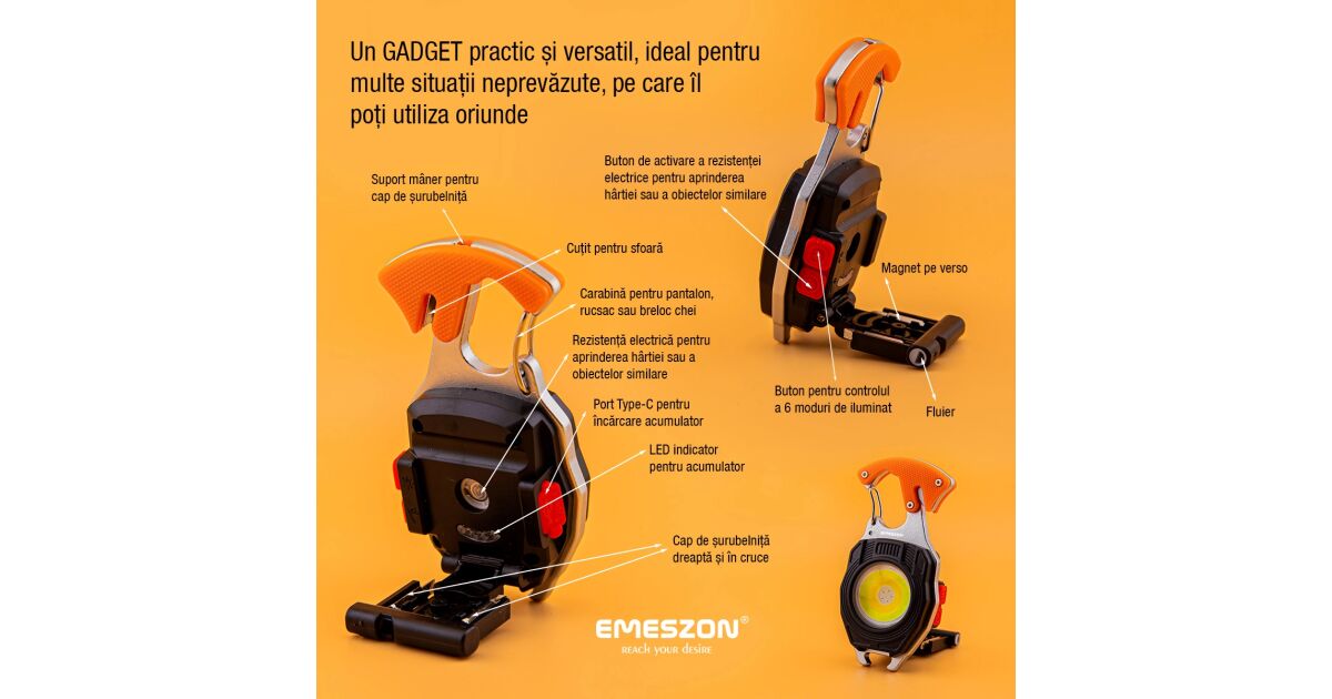 Lanterna versatila COB LED 40W, tip Gadget, EMESZON® CRW5147, 6 Moduri de iluminare, Breloc, Kit de supravietuire, portocaliu Descriere