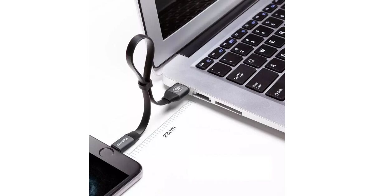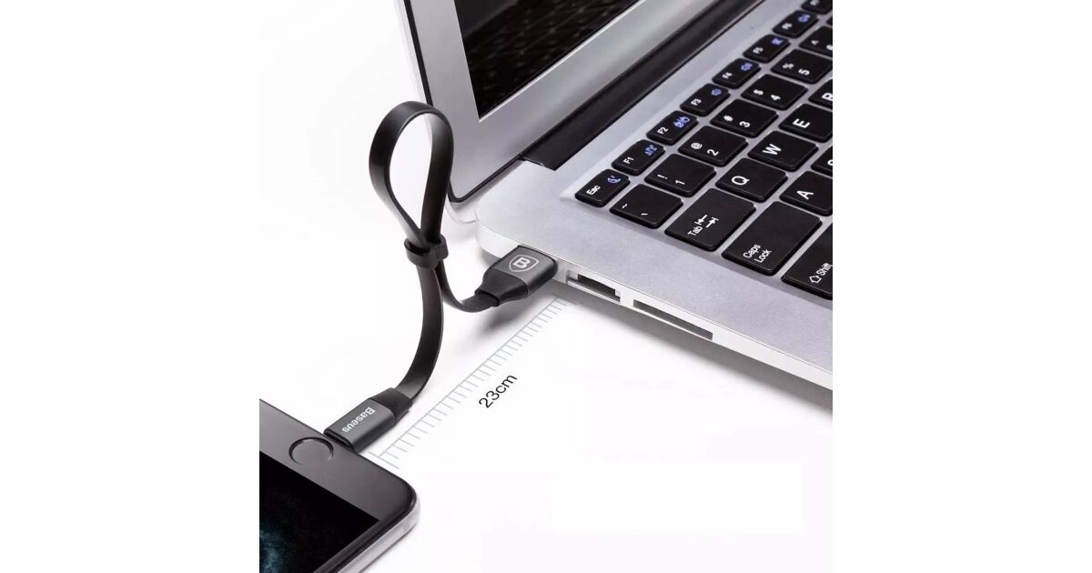 Acest cablu Baseus Nimble plat de 23 cm este alegerea perfectă pentru încărcarea iPhone-ului sau iPad-ului tău și transferul de date. Dimensiunile sale practice și comutatorul integrat îl fac ușor de depozitat și transportat.