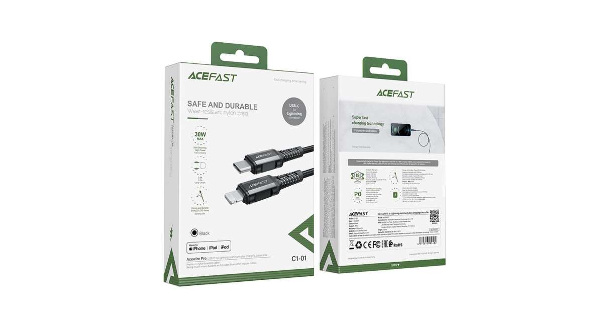 Acesta este un cablu Acefast C1-01 USB-C - Lightning de 1,2 metri lungime, perfect pentru încărcarea rapidă și sigură a iPhone-ului, iPad-ului și iPod-ului tău. Cu o putere maximă de 30W și un curent maxim de 3A, îți vei încărca dispozitivele într-un timp record.
