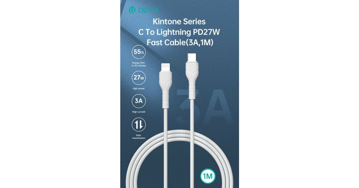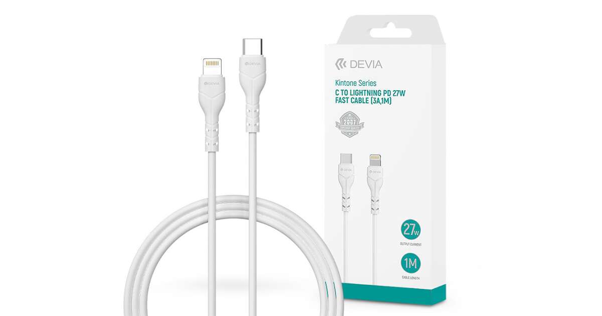 Devia USB Type-C - Lightning adat- és töltőkábel 1 m-es vezetékkel - Devia Kintone Series Type-C to Lightning PD Cable - 27W - fehér Descriere