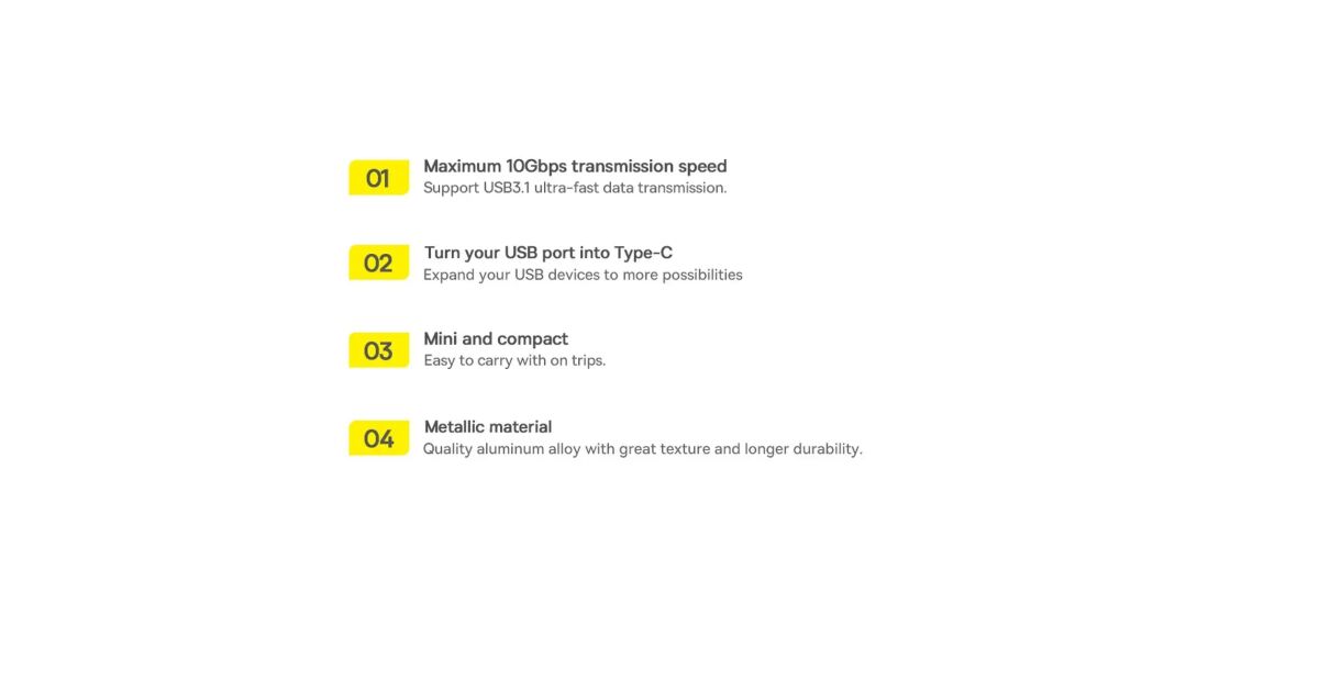 Acest adaptor compact Baseus Ingenuity USB-A (USB 3.1) - USB-C este soluția perfectă pentru transferul de date între dispozitive și încărcare rapidă. Carcasa sa din aliaj de aluminiu de înaltă calitate îl face extrem de durabil și rezistent.