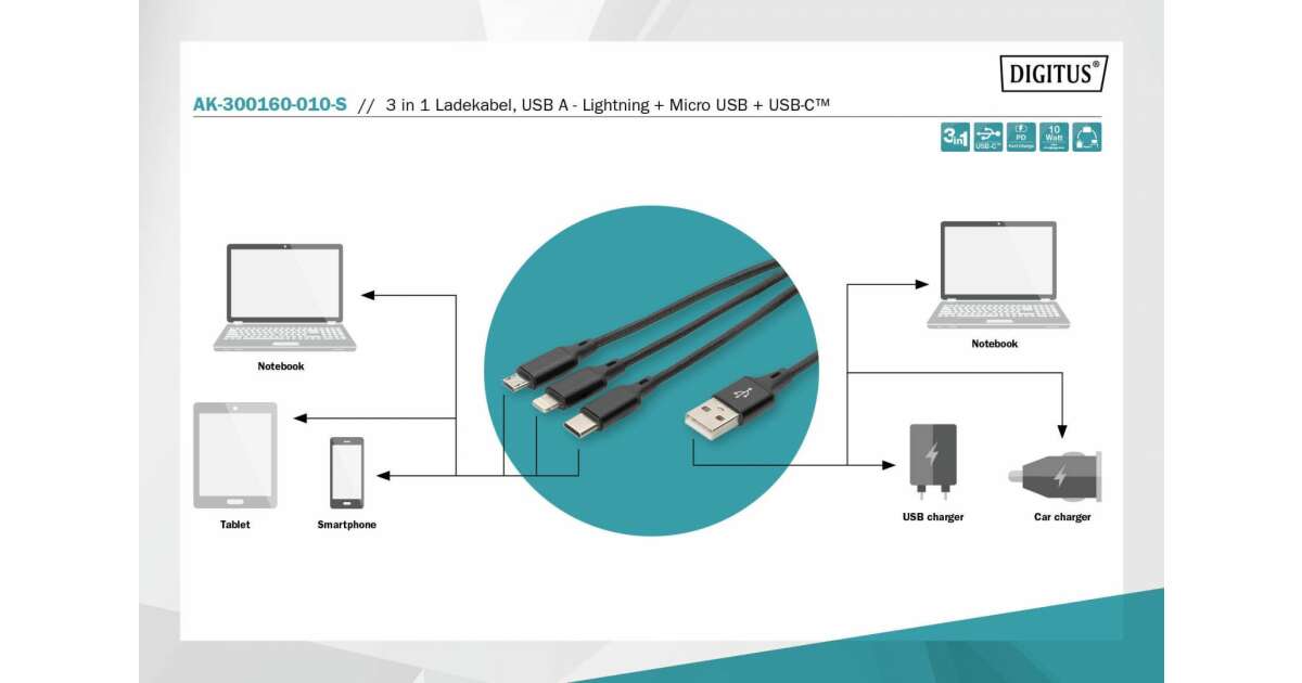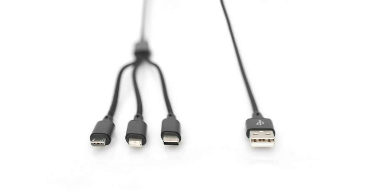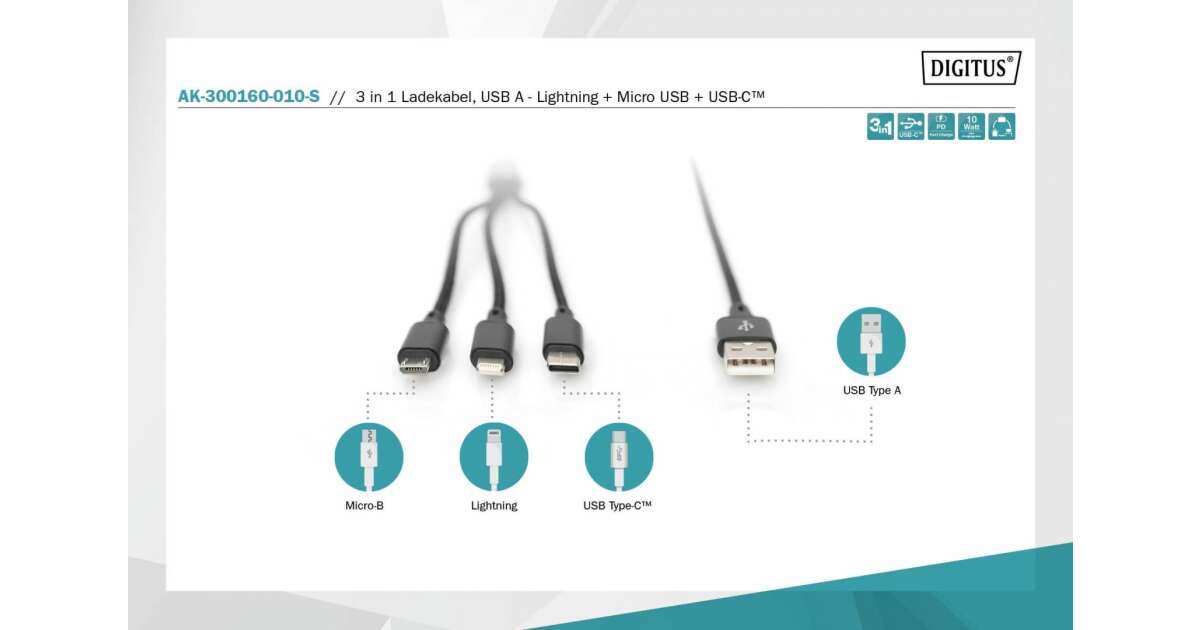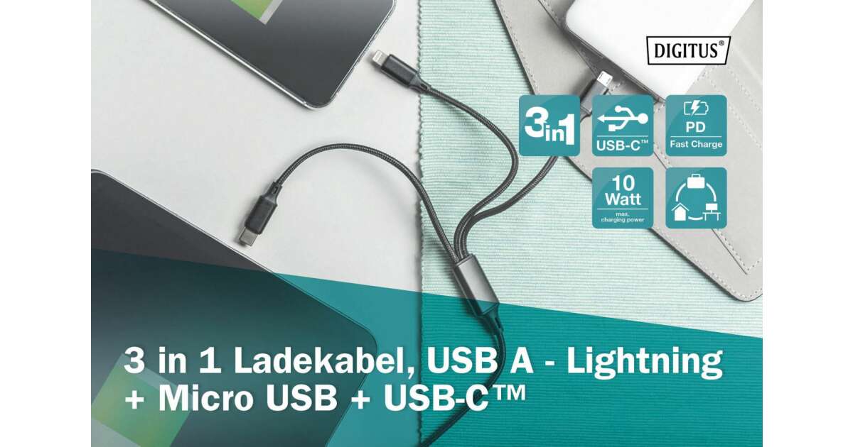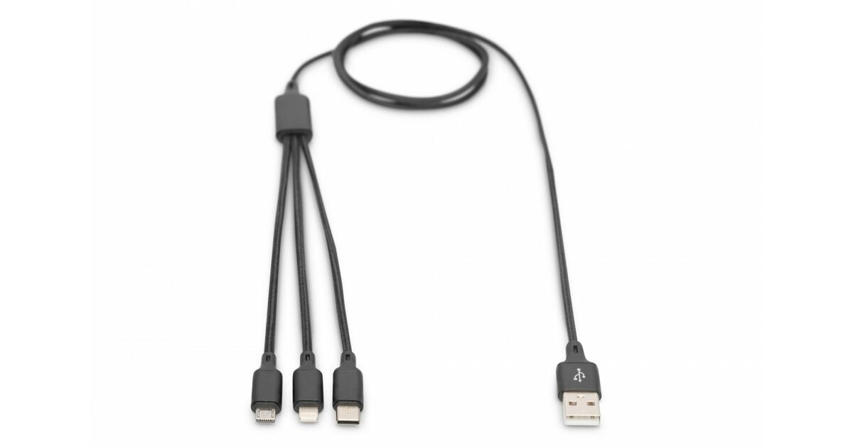 Cablu de incarcare Digitus 3-in-1 pentru dispozitive Apple Android si Google-Pixel 1m negru, cablu
