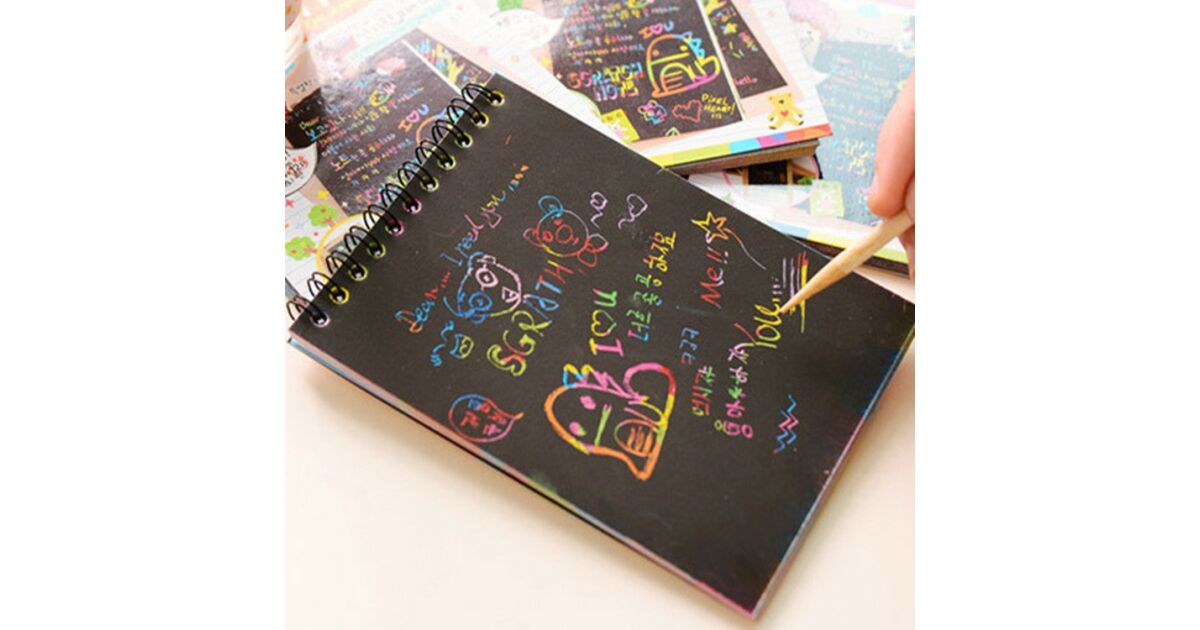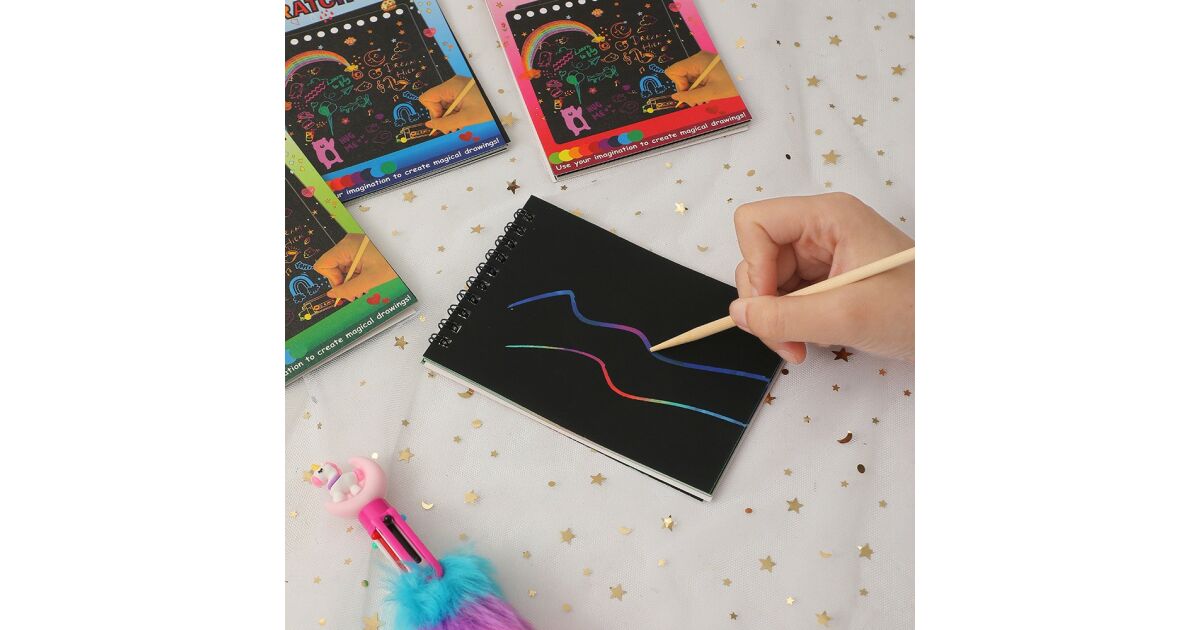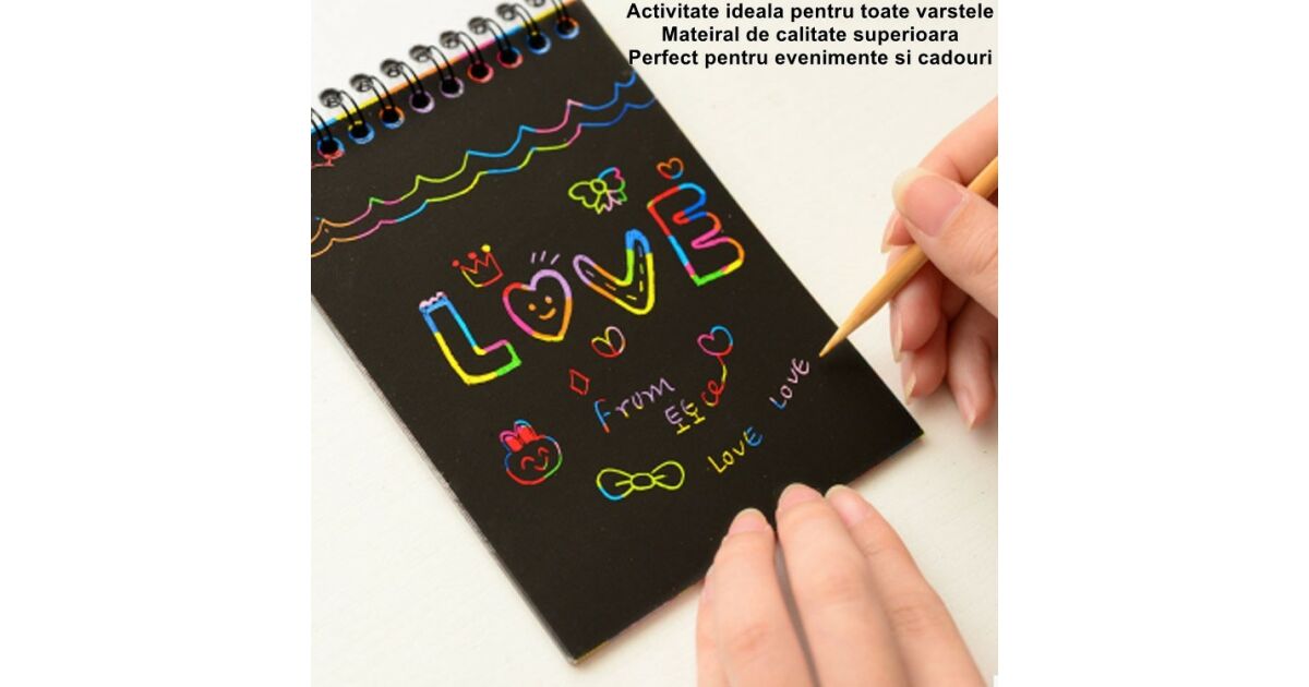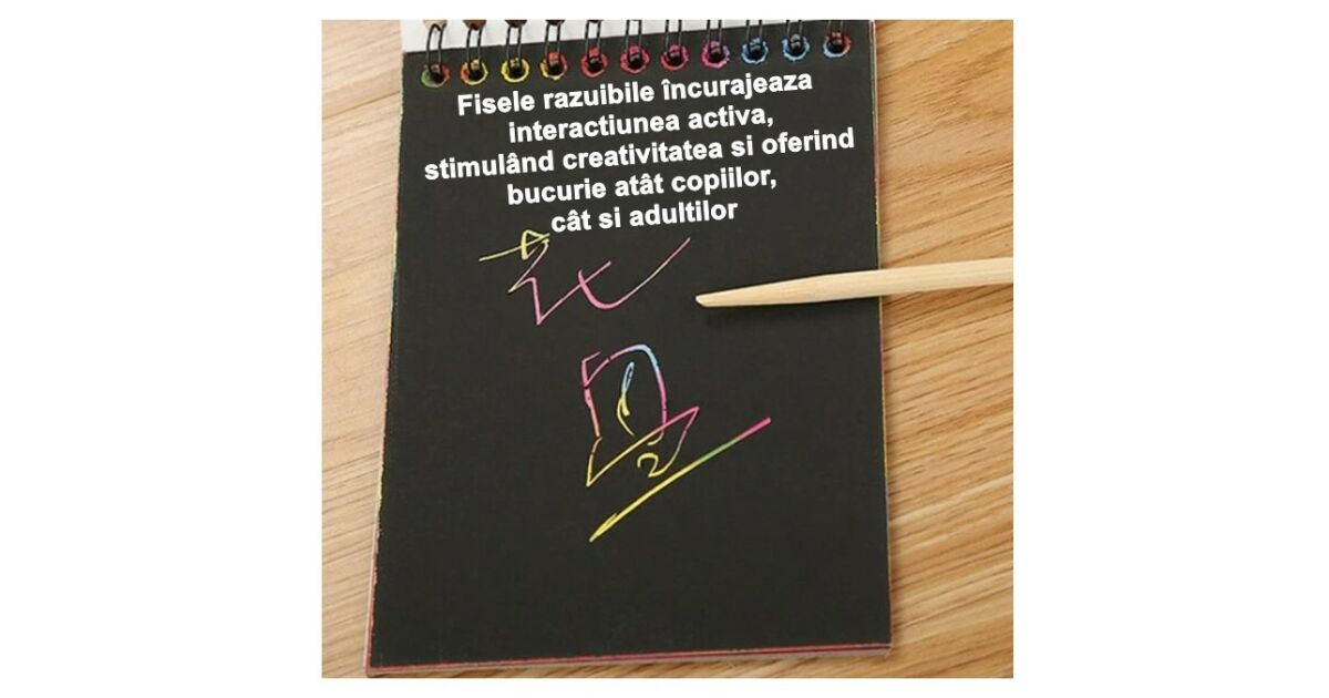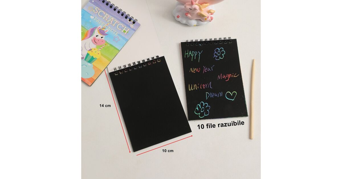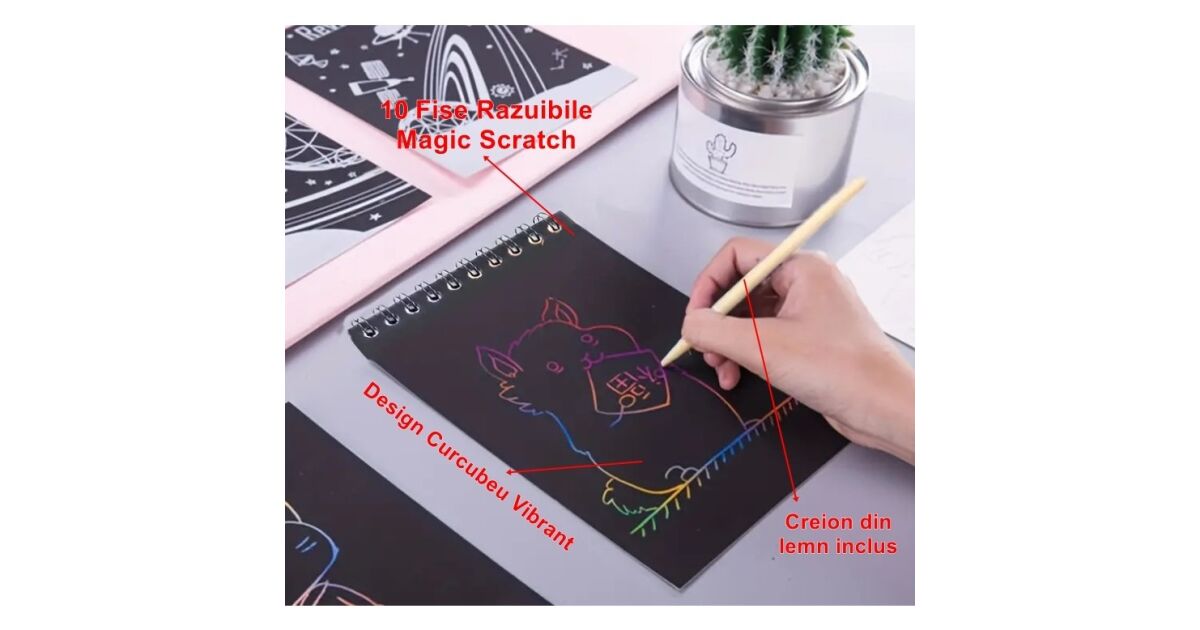 Lasă-ți imaginația să zboare și creează imagini unice și uimitoare! Acest caiet de răzuire garantează o distracție relaxantă atât pentru cei mici, cât și pentru cei mari. Încearcă-l acum!