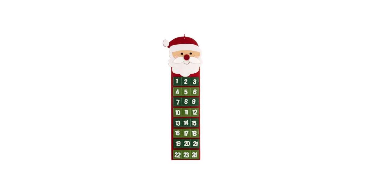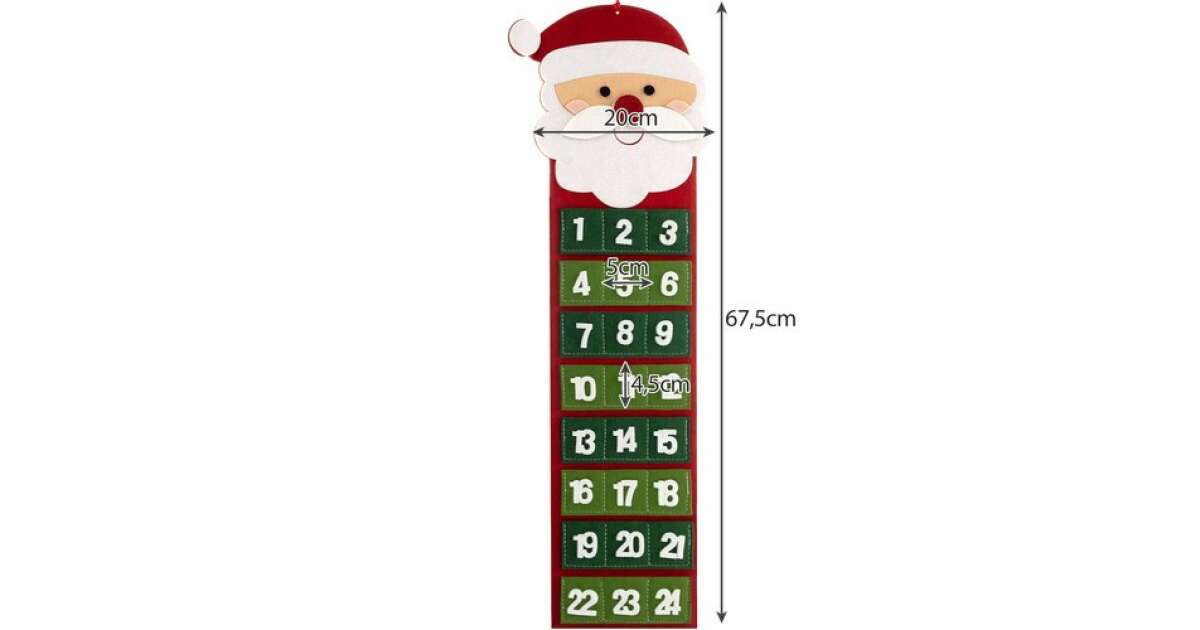 Acest calendar advent superb, din felt, va fi completarea perfectă a decorațiunilor tale de sărbători. Decorat cu un vesel Moș Crăciun, are 24 de buzunărașe numerotate, în care poți ascunde mici cadouri și surprize. Datorită design-ului său suspendat, se poate agăța ușor în brad sau la ușă.