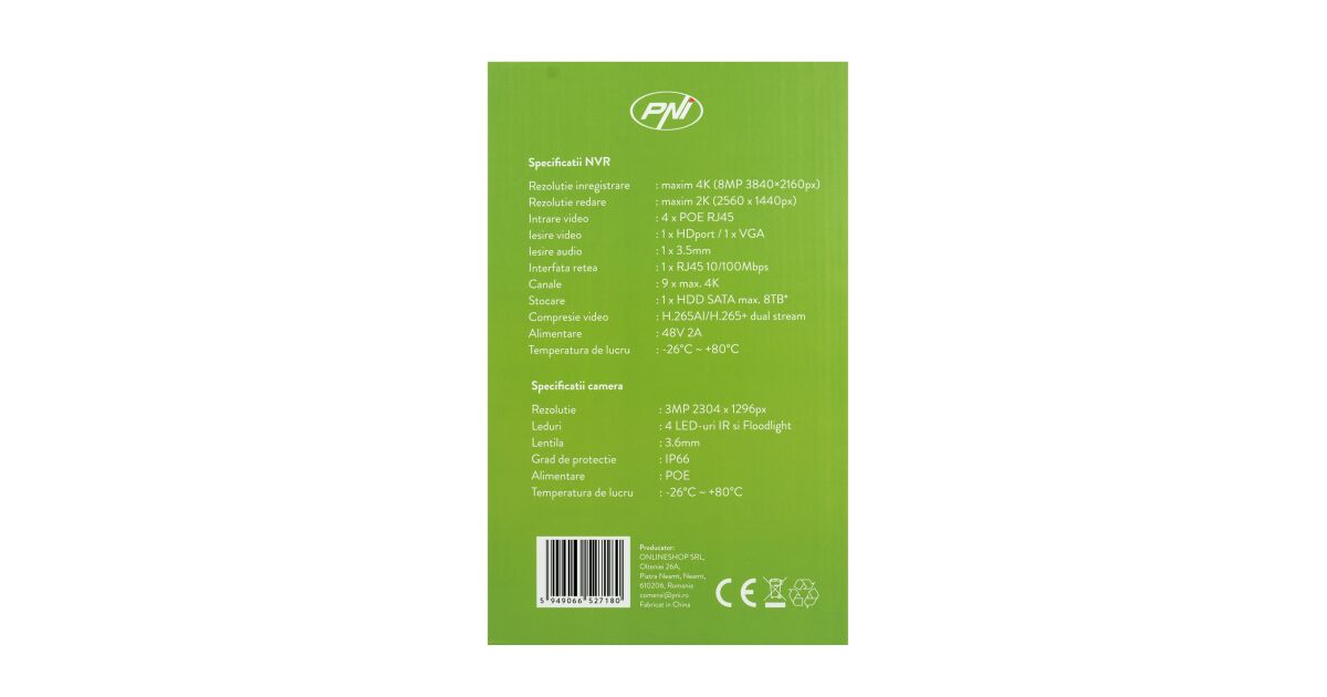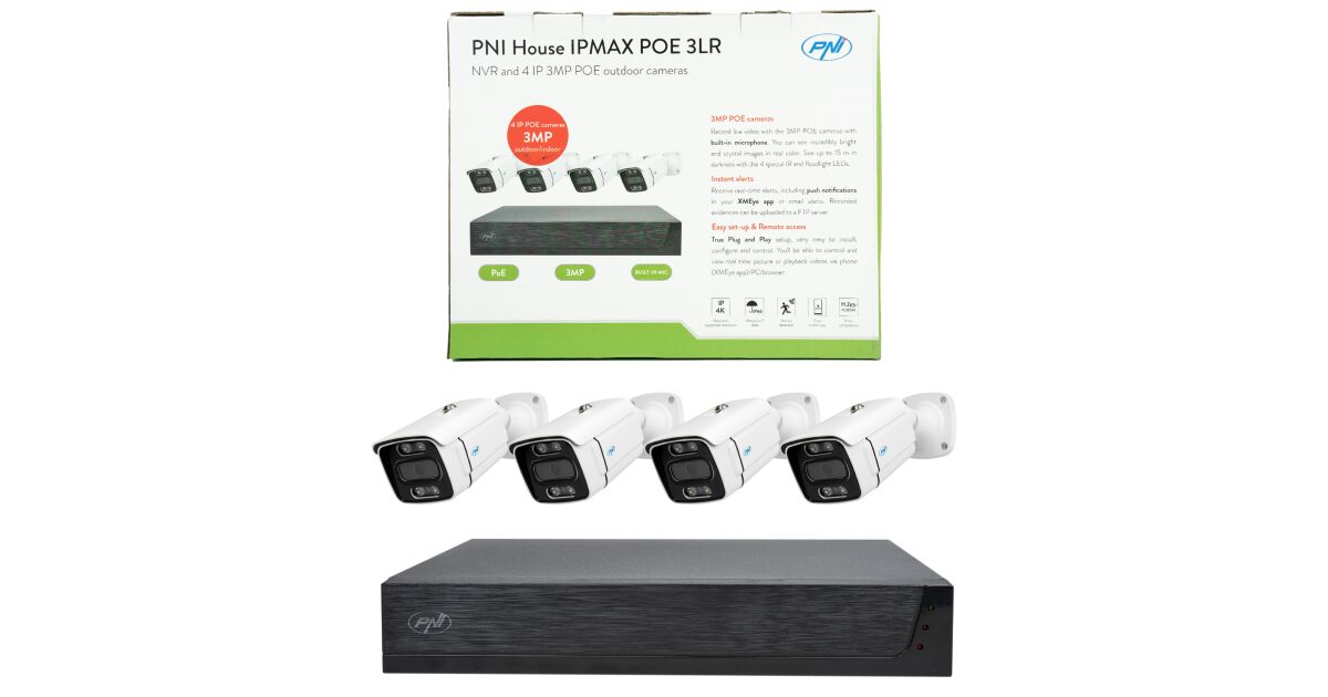 Pachet Kit supraveghere video PNI House IPMAX POE 3LR, NVR cu 4 porturi POE, ONVIF si 4 camere cu IP 3MP, de exterior, Power over Ethernet, detectie chip, detectie miscare, 4 cabluri, alimentator, mou Descriere