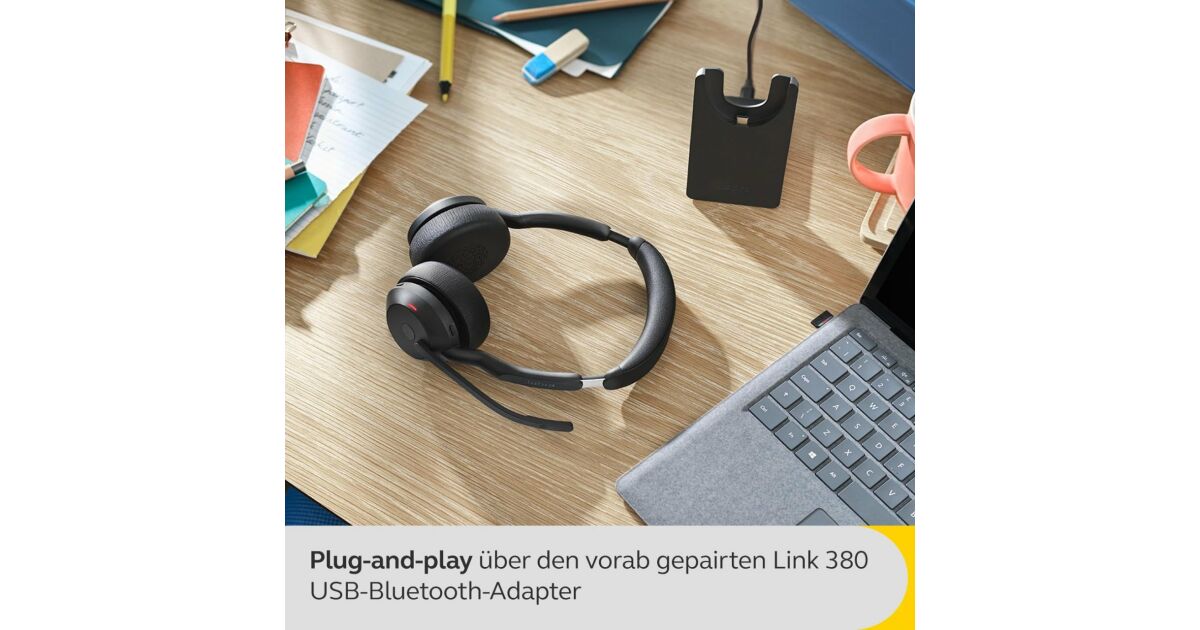 -Jabra Evolve2 55 - Casti stereo fara fir cu statie de incarcare Air Comfort - Microfoane cu anulare a zgomotului si ANC - Compatibil cu toate platformele UC, cum ar fi Zoom si Google Meet - N
