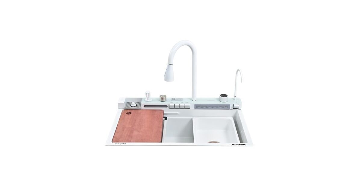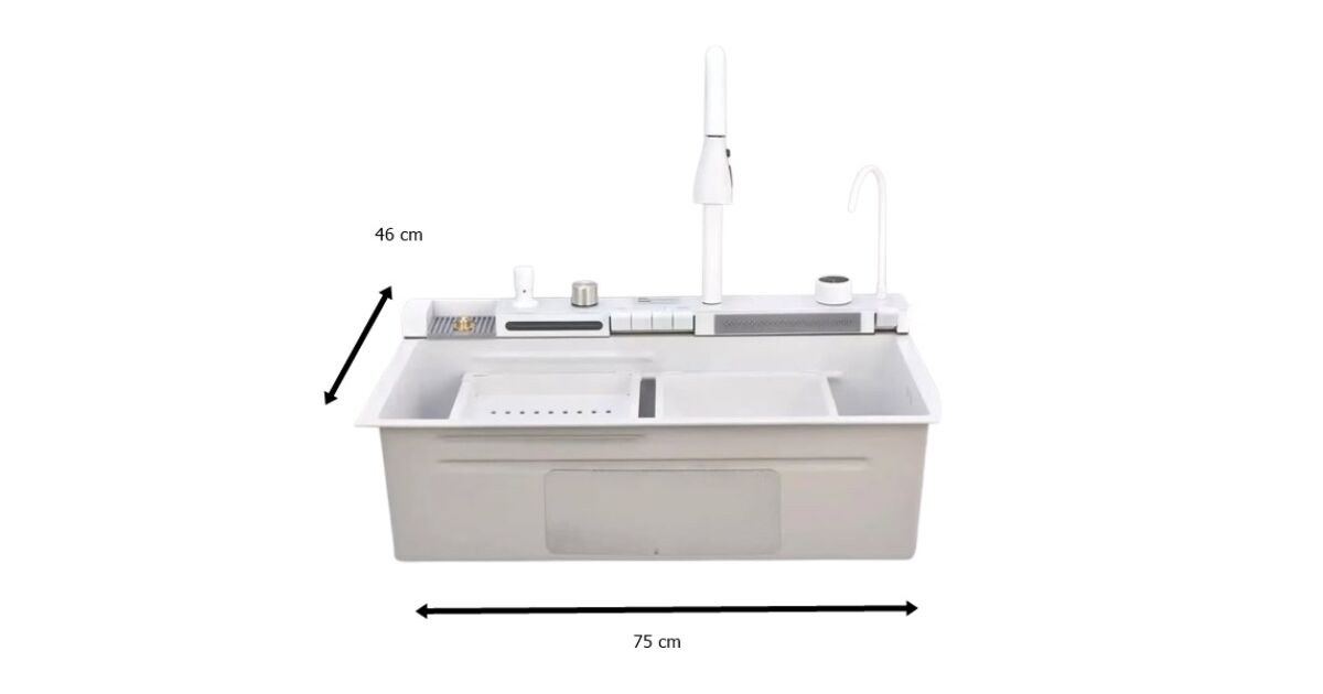 Chiuvetă bucătărie multifuncțională, Duș Extractabil, Tocător Lemn, LCD Temperatură, 2 Jeturi Apă, Alb, 75x46 cm Descriere