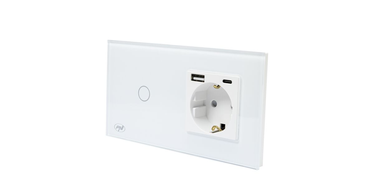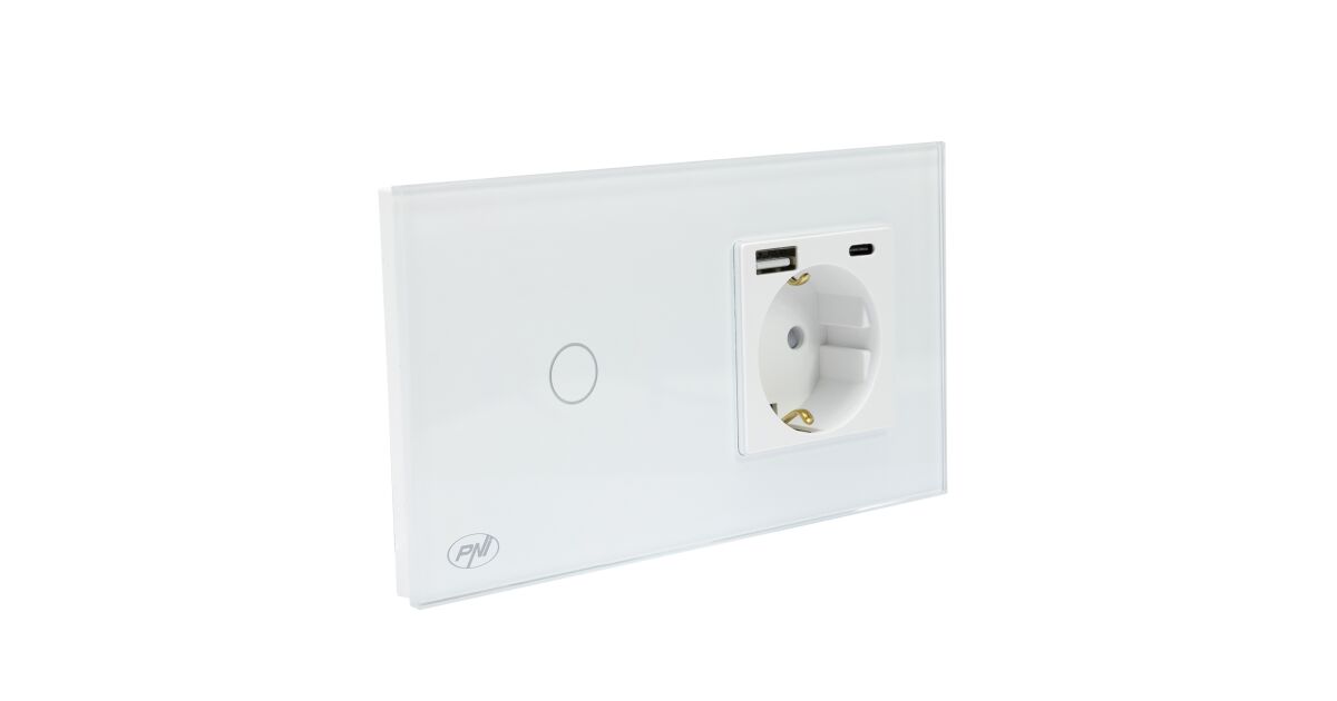 Intrerupator simplu PNI SH115W din sticla cu touch, combinat cu priza Schuko si mufe USB Descriere