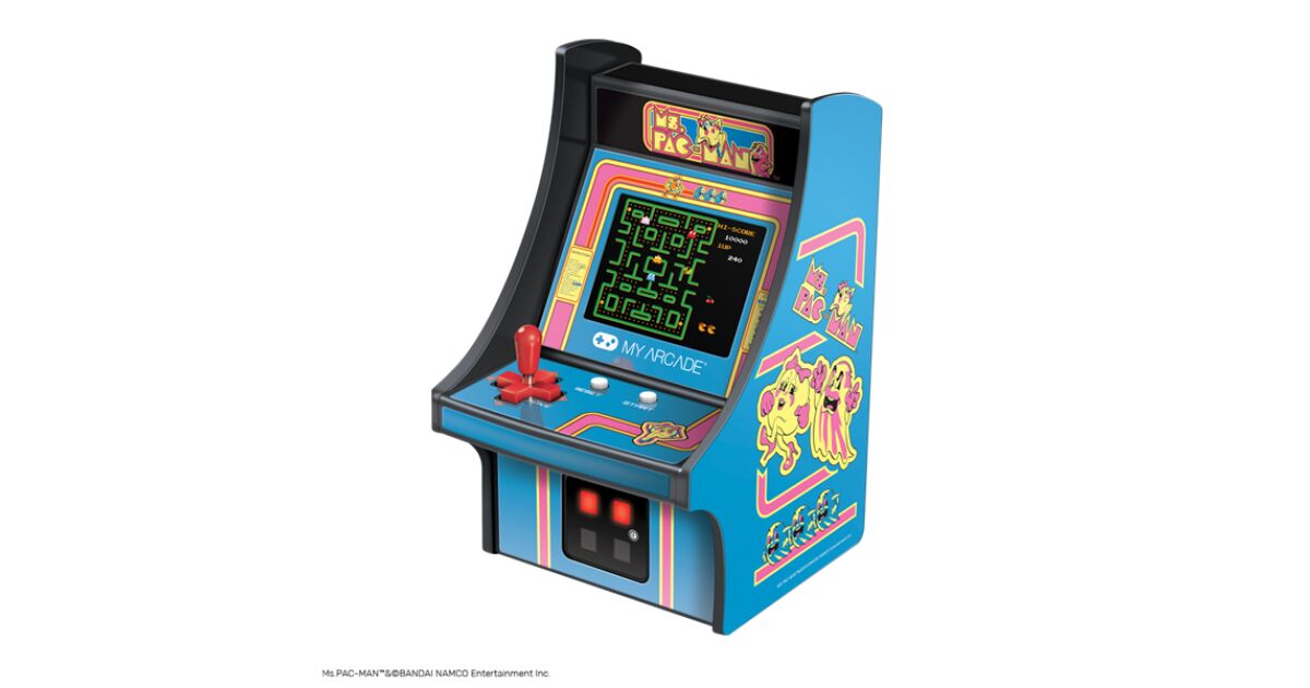 Această consolă de jocuri este cadoul perfect pentru orice fan Ms. Pac-Man și pentru iubitorii de jocuri retro! 🎁