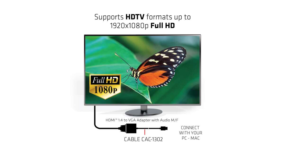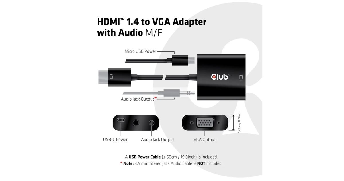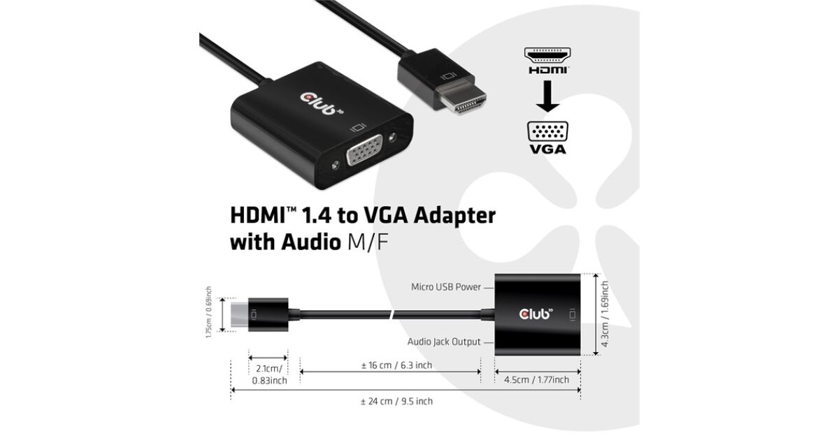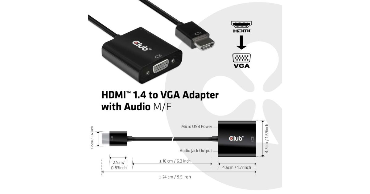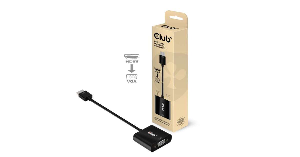 Acest cablu adaptor HDMI-VGA de la Club 3D îți permite să conectezi dispozitivul tău cu ieșire HDMI (de exemplu, laptop, computer, consolă de jocuri) la un monitor sau proiector cu intrare VGA. Datorită ieșirii audio integrate, sunetul se transmite și el prin cablu.